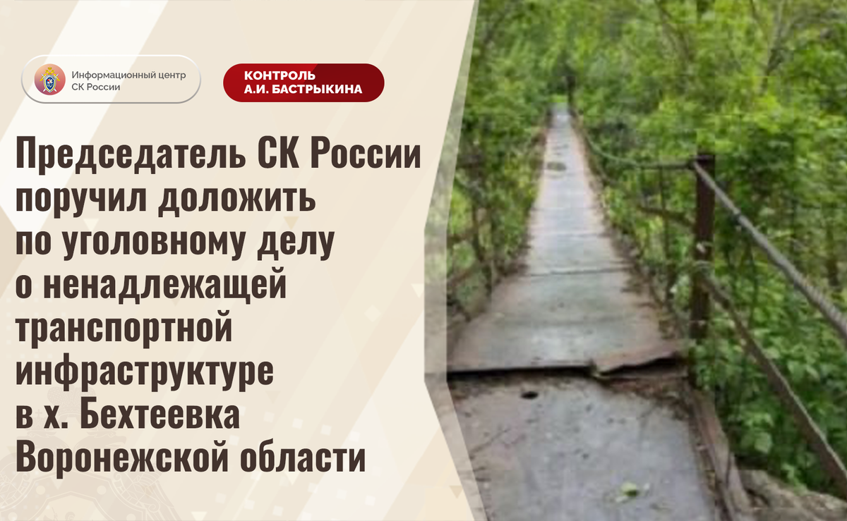 Председатель СК России поручил доложить по уголовному делу о ненадлежащей транспортной инфраструктуре в х. Бехтеевка Воронежской области В СМИ сообщается, что в хуторе Бехтеевка Воронежской области на протяжении длительного времени пешеходный мост через реку, ведущий в населенный пункт, находится в непригодном состоянии: конструкции прогнили и разрушаются, на поверхности образовались многочисленные повреждения. Несмотря на имеющиеся нарушения, мер к организации ремонтных работ не принимается. В СУ СК России по Воронежской области возбуждено уголовное дело. Председатель Следственного комитета Российской Федерации Александр Иванович Бастрыкин поручил руководителю СУ СК России по Воронежской области Михаилу Алексеевичу Селюкову представить доклад о предварительных и окончательных результатах расследования уголовного дела. Исполнение поручения поставлено на контроль в центральном аппарате ведомства. #СледственныйКомитет #СКРоссии #СКР #ИЦСКР #ИнформационныйЦентр #АлександрБастрыкин #Предс