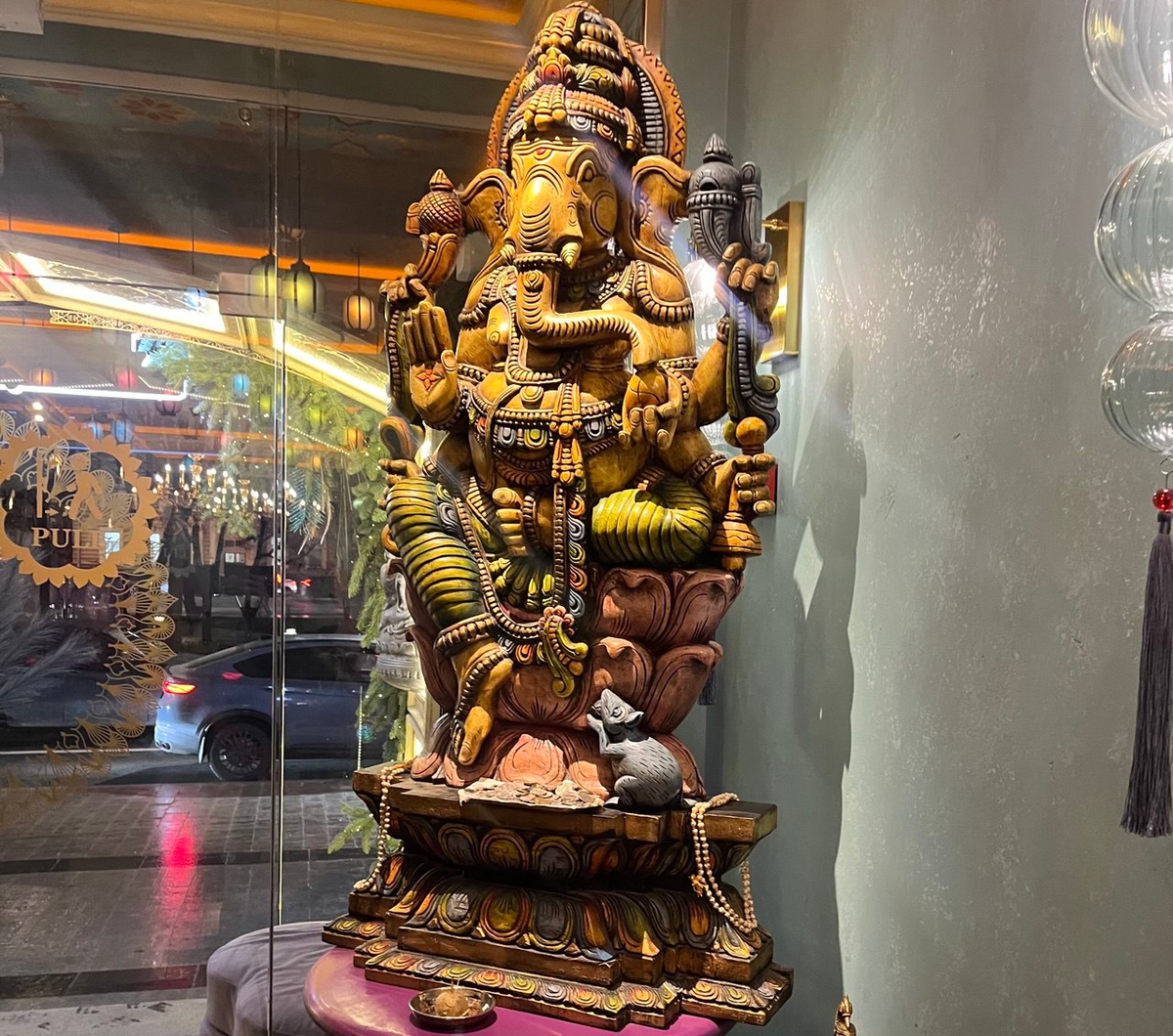 Образы индийских богов и героев представлены в современном исполнении, но при этом гармонично вписаны в общий художественный ансамбль. Росписи стен и потолков выполнены вручную, а почти каждый элемент декора был лично выбран владельцем в Индии и привезен в Москву.
