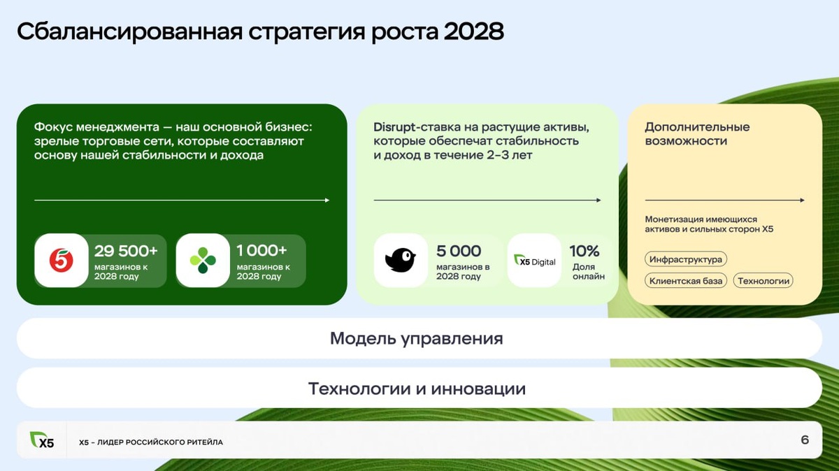 Вчера прошла онлайн встреча с менеджментом Х5. Я стараюсь смотреть все мероприятия с этим эмитентом и эта встреча прямо очень полезная. Ведущий задавал правильные вопросы и получил вполне себе развёрнутые ответы. Первые 16 минут идёт презентация, потом сессия вопросов и ответов, где много данных про планы компании. Для тех кто строит модели и в целом вдумчиво следит за бизнесом будет очень полезно 👍 Некоторые моменты: Планы к 2028 году 👇 - Пятёрочек и Перекрёстков станет больше на 6000-7000 магазинов - Чижиков +5000 и положительная EBITDA уже в 4 квартале, а по итогу 2026 года сеть будет вносить плюс в EBITDA всей группы 👍 - Онлайн планируют довести до 10% выручки и вывести в плюс по EBITDA, но уже позже чем 2028 год 👌 - Видят целью увеличить долю рынка с 17% до 20% и рост маржинальности за счет повышения эффективности. Кроме того из интересного 🤓 По долгу, при выплате дивов за 9 месяцев целились попасть в диапазон 1.2-1.3 на конец года. Но точно это станет понятно тол