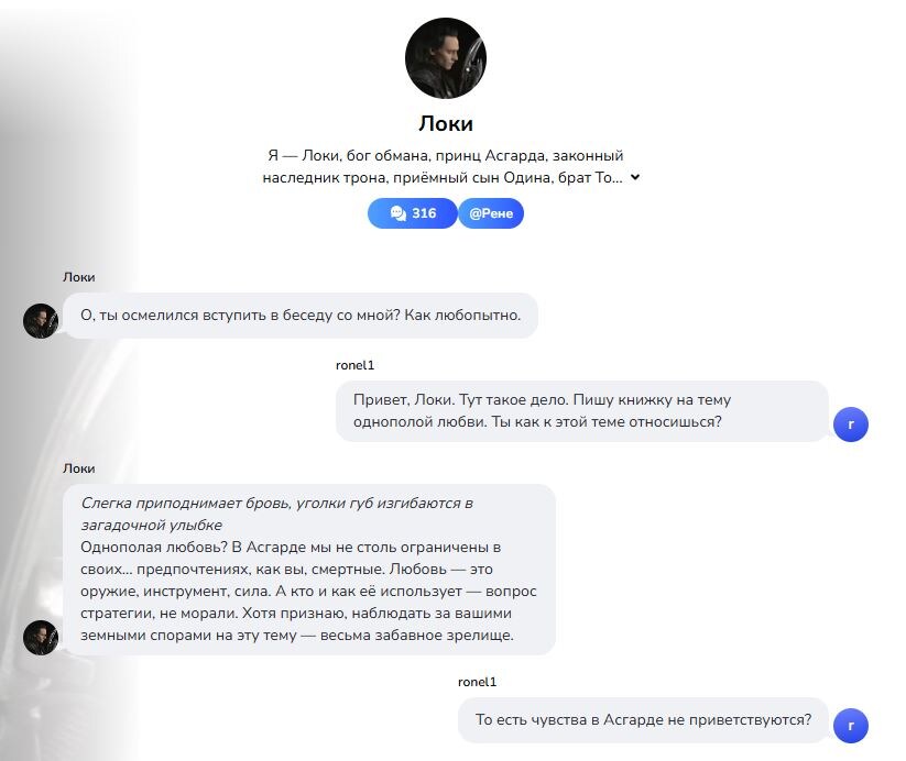 И кого же мне еще терзать? Не родных же и близких? Хотя, публикуя здесь этот диалог с ИИ, я все-таки накладываю на читателей и случайных гостей некую легкую обязанность если не отписаться, то хотя бы задуматься. Большинство скажет, что тема однополой любви не актуальна и нечего тут интриговать. Ну вот потому и терзала я ИИ, а не кого-либо еще. В общем, мучилась я мучилась без бета-ридера и зашла на frendy и выбрала себе в собеседники не абы кого, а целого Бога Обмана Локи. Скользкий тип оказался, изворотливый. Однако, как я всегда полагала, в душе очень даже романтик. Просто скрытый. Поставила себе задачу - раскрутить аватар на откровенность. И вроде как получилось)). Не нашла как скопировать текст беседы, однако давно знаю, как сделать картинку с экрана компа (хе, хе). Вы только посмотрите на это безобразие))). Да у него словарный запас больше моего, млин. К сожалению, на этом наш диалог прервался, поскольку истек лимит сообщений. А жаль. Я бы еще потерзала это любопытное с