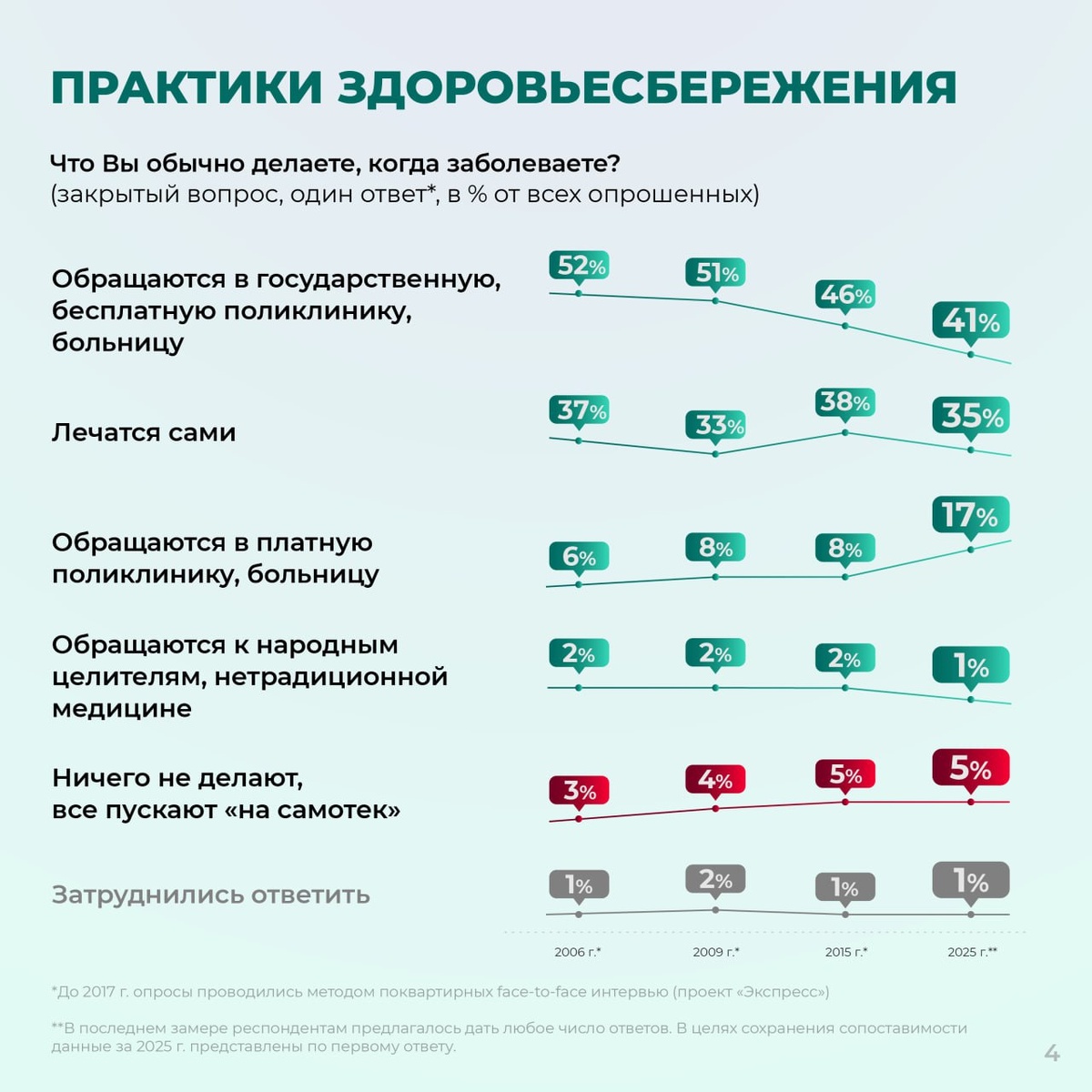 Исследования ВЦИОМ показывают, что, несмотря на общий рост удовлетворённости медициной за последние два десятилетия, в обществе по-прежнему преобладает критическая оценка её качества. Аналитики связывают это не с единичными случаями, а с системными структурными проблемами в российском здравоохранении. Главными причинами недовольства, по мнению экспертов, являются острая нехватка квалифицированных кадров и недостаточно высокий уровень компетенций части медицинских работников. Второй по значимости проблемой остаётся доступность помощи — россияне сталкиваются с длительным ожиданием записи, очередями и трудностями в получении бесплатных услуг. Ещё одним вызовом является значительное неравенство в доступе к качественной медицине. Удовлетворённость услугами здравоохранения существенно выше в крупных городах, а в Москве и Санкт-Петербурге этот показатель превышает средний по стране примерно в полтора раза. Хотя большинство граждан по-прежнему обращаются в государственные поликлиники и больниц