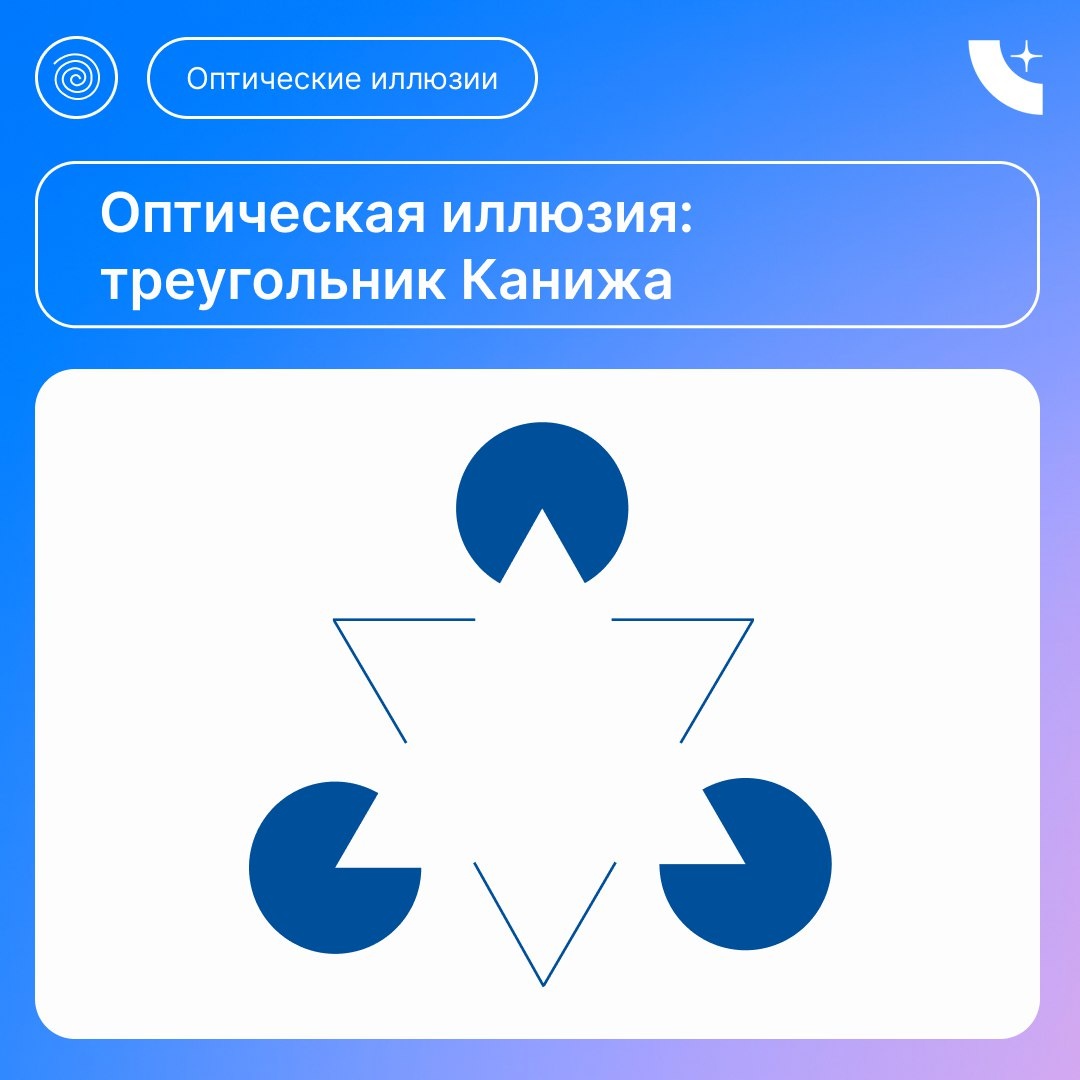 Играем со зрением: фигура «появляется» там, где её не рисовали. Посмотрите на картинку и попробуйте догадаться, почему так происходит 🔎 «Белый» треугольник появляется без единой проведённой линии — мозг собирает целое из подсказок: вырезы в синих кругах и срезанные углы заставляют нас додумывать невидимую границу. Это эффект субъективных контуров, известный как треугольник Канижа. Попробуйте прикрыть вырезы или повернуть экран: как только исчезнут намёки формы, пропадёт и треугольник. 🧠 👉 Вы можете записаться на диагностику и операцию в любую клинику, на удобную вам дату по бесплатному телефону горячей линии: 88001009876 или онлайн по ссылке: glorias.ru/glmhg/?utm_source=tg&utm_medium=smm&utm_campaign=common_post 18+. Имеются противопоказания, необходима консультация специалиста. ⭐️ Глазные операции, доступные каждому!