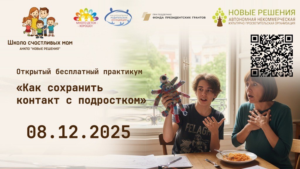 КАК СОХРАНИТЬ КОНТАКТ С ПОДРОСТКОМ ☀️Приглашаем вас в понедельник, 8 декабря, в 12-00 мск на занятие в бесплатной онлайн «Школе счастливых мам»! 🥰На занятии 8 декабря вы: - Узнаете секреты создания эмоциональной безопасности подростка и насыщения ребенка чувством безусловной любви. - Поймете типичные ошибки родителей, влияющие на эмоциональное состояние подростка. - Овладеете конкретными техниками сохранения контакта с подростком. - Научитесь распознавать признаки, которые показывают, что ребенок ощущает нашу любовь. И те признаки, что указывают на недостаточную проявленность любви. - Создадите алгоритм укрепления эмоциональной связи и контакта с ребенком. Вебинар проведет Наталья Григорьевна Калашникова, доктор пед. наук, профессор, автор и руководитель проекта. 💥Для того, чтобы присоединиться к занятию, используйте QR-код или эту ссылку: https://pruffme.com/landing/u2631789/20251208_10 📌Подробнее про проект читайте здесь ✅Все новости «Школы счастливых мам» в нашем канале Пр