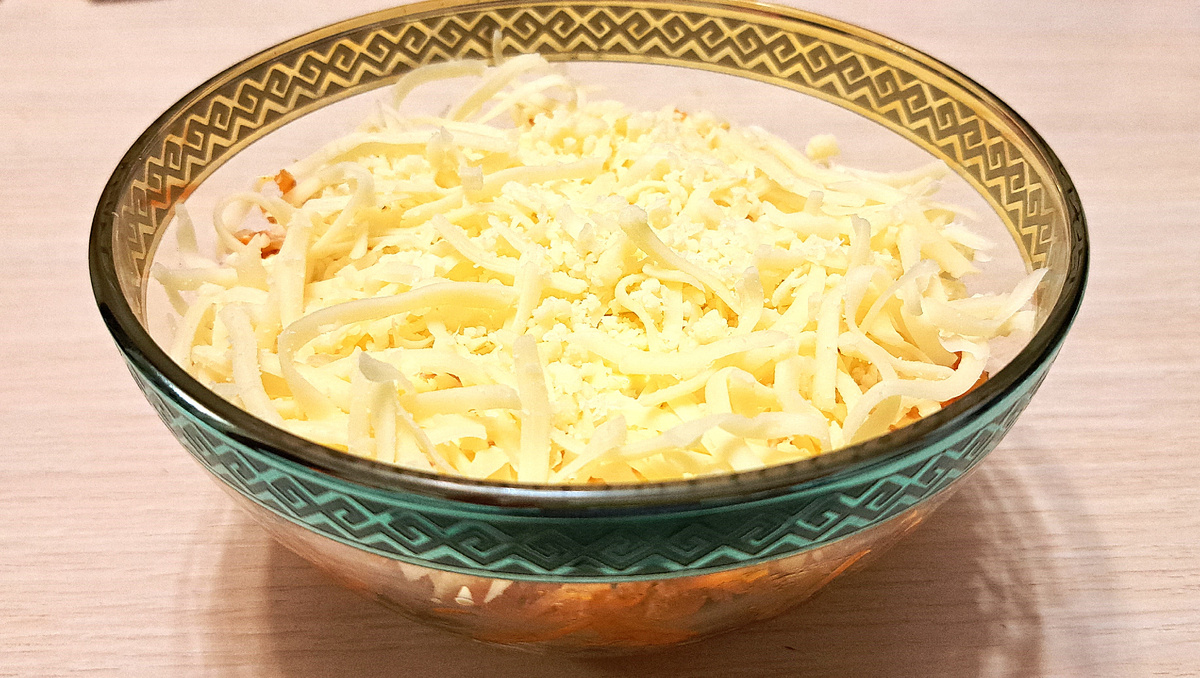 Этот салат получил название за способность сохранять свежесть несколько дней. Его можно приготовить заранее — за 24 часа до подачи. Сочетание копченой курицы, жареных грибов и моркови по-корейски создает насыщенный вкус, а сырная корочка защищает нижние слои от высыхания. Ингредиенты филе копченой курицы — 300 г; шампиньоны свежие — 250 г; морковь по-корейски — 200 г; сыр твердый — 150 г; лук репчатый — 1 шт.; майонез — 150 г; масло растительное для жарки; соль, перец по вкусу. Копченое куриное филе нарежьте крупными кусочками. Равномерно распределите майонез тонким слоем. Шампиньоны промойте, нарежьте пластинами. Лук измельчите кубиками. Обжарьте на растительном масле до золотистого цвета и полного выпаривания жидкости. Посолите. Поверх курицы разместите остывшие жареные грибы с луком. Смажьте майонезом. Выложите морковь по-корейски, предварительно отжав от лишнего маринада. Промажьте майонезом. Покройте салат тертым сыром. Накройте пищевой пленкой, уберите в холодильник миниму