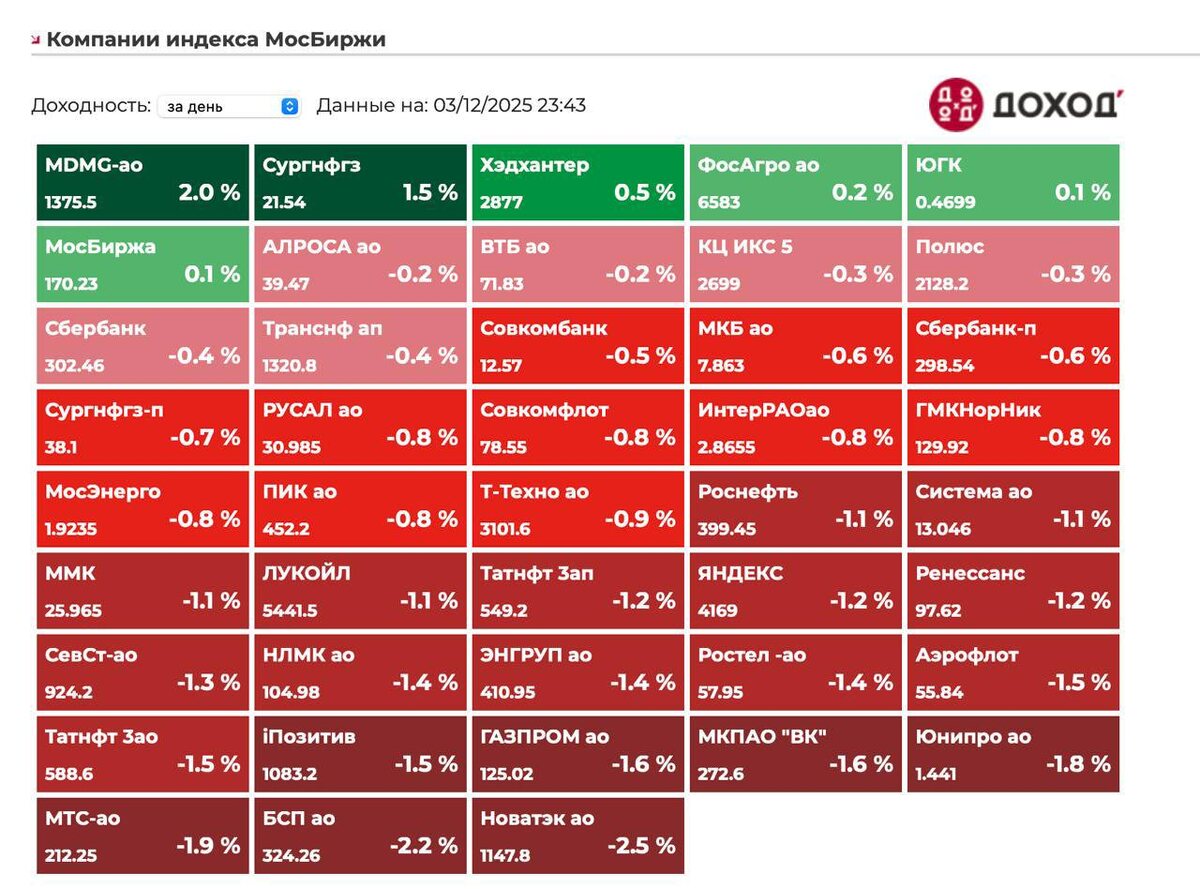 РФ рынок: что нас ждет сегодня В среду индекс мосбиржи упал на 0,9% до 2643 пунктов Юань упал на 0,82% до 10,87. Нефть выросла на 0,62% до $62,9. Инфляция: цены замерли За последнею неделю цены выросли на 0,04%! С учетом корректировки на сезонность ниже таргета в 4%. Это на порядок лучше цифр за 2024 год и один и топ 2 показатель за последние 10 лет. В годовом выражении цены выросли на 6,54% vs 6,9% на прошлой неделе. Что это значит - инфляция идет ниже прогнозной траектории Центробанка в 6,5-7% по 2025 году. По итогу 2025 года инфляция будет ниже 6%. Ждем ставку 16% на декабрьском заседании. Причем видно было заранее, что кто-то тарит на инсайде по недельному принту. Валюта: доллар грязная бумажка Рубль в этом году бьет все рекорды - доллар снова ниже 76,6. Это минимум за последние 2,5 года. Цена рублебочки пробила 3500 рублей вниз - это падение стоимости нефти на 40% г/г и это тоже минимум с начала 2023 года. 4кв для нефтегаза будет непростым. Вышел новый фактор за укрепление
