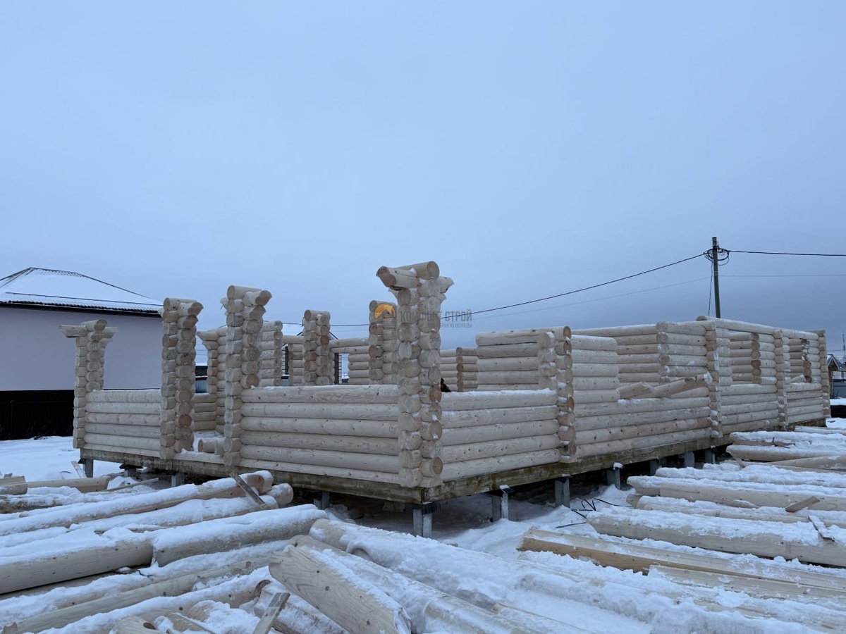 Полным ходом идёт сборка дома из оцилиндрованного бревна диаметром 240 мм