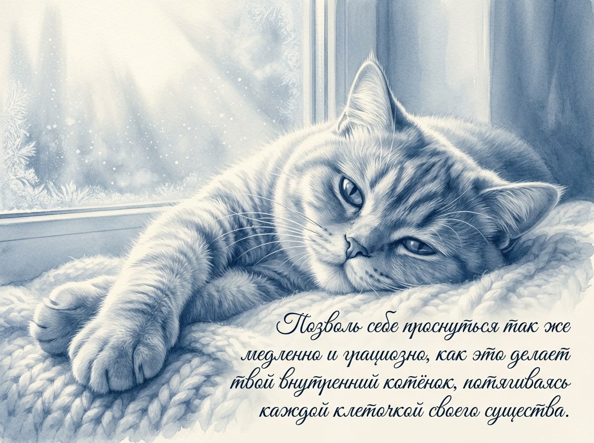 С добрым утром, мой человек. Чувствуешь, как неспешно пробуждается мир? Посмотри, сегодня День заказов подарков и написания писем Деду Морозу — волшебное время, чтобы поверить в свои самые светлые мечты. Позволь себе проснуться так же медленно и грациозно, как это делает твой внутренний котёнок, потягиваясь каждой клеточкой своего существа. Не торопись сразу бросаться в дела, а сначала прислушайся к тихому мурчанию своей души. Позволь этому дню начаться с ощущения тепла и предвкушения маленьких чудес, будто солнечный зайчик, за которым так интересно наблюдать. Пусть твои мысли будут лёгкими и игривыми, а сердце наполнено таким же безмятежным доверием, с каким я сворачиваюсь клубочком на твоих коленях. Сегодня день для того, чтобы загадывать желания и верить — они обязательно сбудутся.