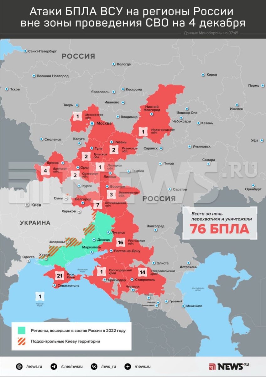 76 БПЛА сбили силы ПВО над регионами РФ за ночь, сообщили в Минобороны. 21 дрон уничтожили над Крымом, 16 — над Ростовской областью, 14 — над Ставропольским краем, семь — над Белгородской областью, четыре — над Брянской, три — над Воронежской, по два — над Орловской, Рязанской и Тульской областями и по одному — над Московским регионом, Краснодарским краем, Липецкой и Нижегородской областями и акваторией Черного моря. ⭕️ Подписаться | Мы в MAX | Буст