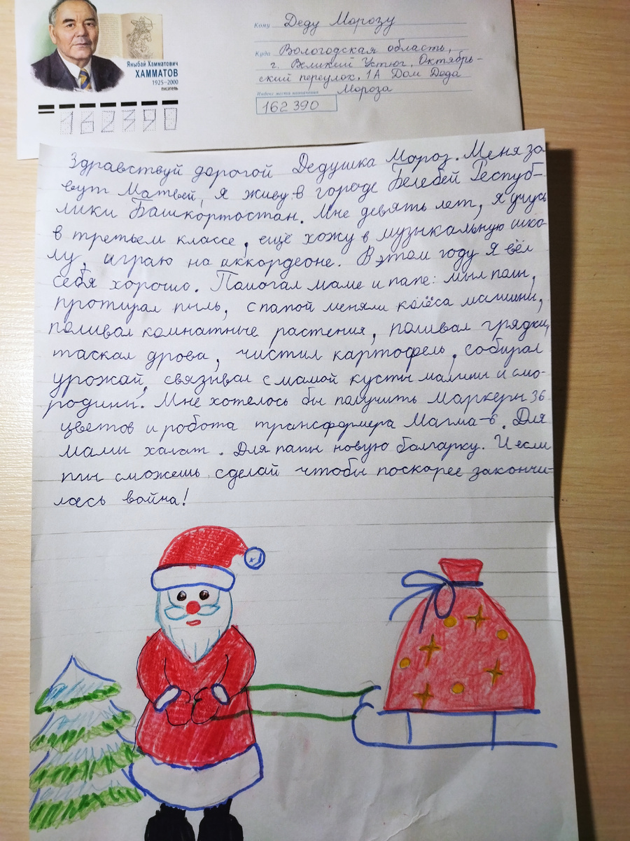 4 декабря - День заказов подарков и написания писем Деду Морозу. С этой даты официально открывается сезон новогодней почты. Письмо в черновом варианте у нас уже было написано. Вчера Матвей его переписал и нарисовал рисунок, не успел только оформить его в цвете, время позднее уже было. Узнав сегодня по новостям про День написания писем Деду Морозу, докрасил рисунок утром до школы. Как будто предугадал! Бывает же такое! Сегодня отправим письмо и будем ждать подарок под елкой. А вы написали письмо Деду Морозу? Пишите и ждите чуда, и оно обязательно сбудется.