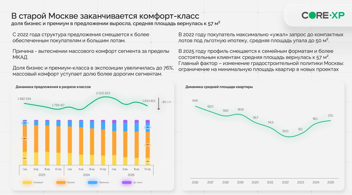 Итоги 2025 в жилой недвижимости и ожидания от 2026 Подбили статистику по рынку новостроек внутри МКАД за 2025 - пора подводить итоги года и строить стратегию на 2026. 1. Старая Москва окончательно ушла в «дорогие» классы Коммерческий комфорт внутри МКАД доживает последние метры – теперь он в Новой Москве или у Фонда реновации. С 2022 года экспозиция системно смещается в сторону больших лотов и более состоятельной аудитории. В 2025 средняя площадь квартиры вернулась к 57 м² - привет новым ограничениям по минималке и пожеланиям властей по количеству квартир. От «студий под льготную» рынок постепенно смещается к семейным форматам. 2. Старты ограничены, запасы - под контролем Девелоперы живут в режиме «дорогих денег» и экономят патроны старты. Динамика запусков новых ЖК за год -35%. Витрина поддерживается на относительно стабильном уровне. Результат очевидный: квадрат дорожает просто потому, что строится меньше. 3. Цены поляризуются Комфорт застыл: покупатель на ипотеке больше не выдер