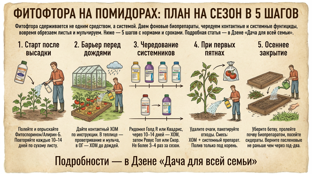1) Успех дает система: профилактика, чередование препаратов и грамотная обрезка. 2) При первых пятнах работаем в связке: санитарная обрезка + контактный + системный фунгицид. 3) Интервал 10-14 дней и последняя обработка за 14-30 дней до уборки — безопасный ориентир. 4) Мульча, проветривание и полив под корень уменьшают риск заражения без лишних затрат. 5) Севооборот, уборка ботвы и обработка почвы осенью — инвестиция в следующий сезон.