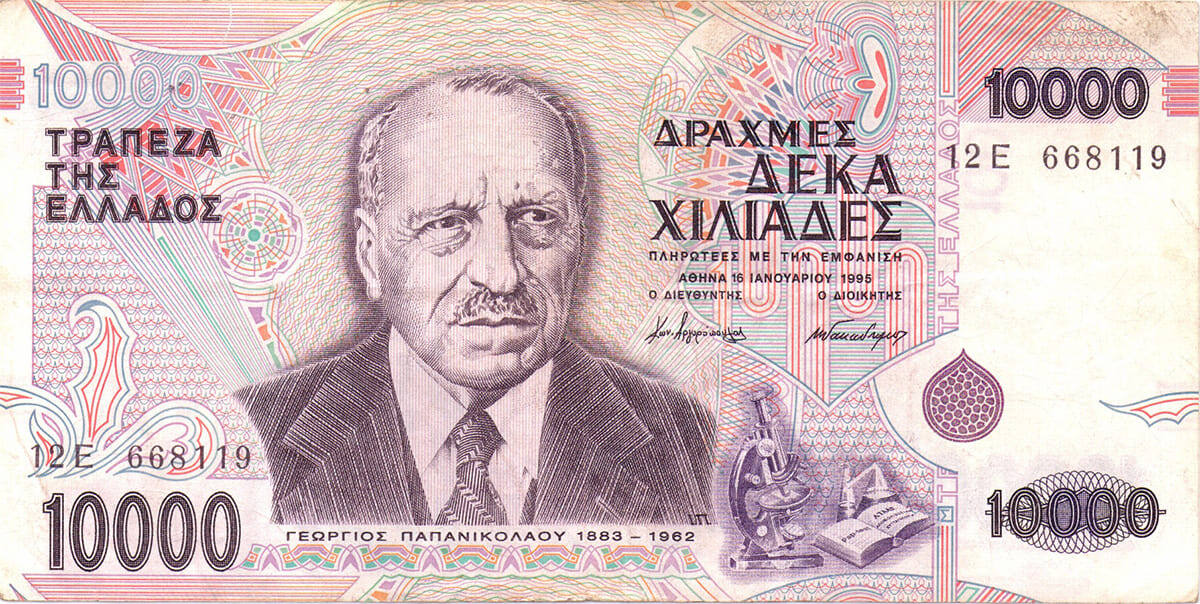 Самый крупный номинал купюры последней серии банкнот Греции (1995-1997 г.) перед тем как в 2002 году греческая драхма была заменена на евро. Греческая драхма была одной из самых старых валют на территории Европы, но с переходом на общую европейскую валюту греческие банкноты потеряли свою идентичность. Но, нужно признать, что драхма в Греции до введения евро существовала в немного подвешенном состоянии. С 1973-го ее курс по отношению к доллару не поднимался (если не считать незначительных скачков). Поэтому переход на единые ЕС платежные средства стал однозначным шагом вперед, укрепившим экономику государства. Размер: 153×77 мм. Основной цвет пурпурный и фиолетовый. Защитные элементы: в качестве водяного знака голова Филиппа II Македонского. Вся банкнота заполнена витьеватыми узорами переходящий из одного в другой, поверх которых находится основные рисунки. В левом верхнем углу находится цифровое обозначение номинала "10 000", которое повторяется в каждом углу лицевой стороны банкноты р