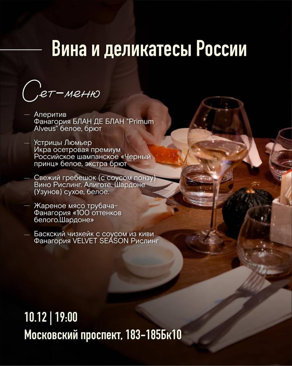 Delicates Club приглашает вас на вечер современных российских вин 🍷 Команда Delicates club создала изысканное сет-меню, а сомелье Вероника Смирнова лично подобрала уникальный сет из вин, каждое из которых идеально гармонирует с предложенным блюдом. Что вас ждет? 🥂 Элегантный аперитив. Игристое вино Фанагория Primum Alveus Blanc de Blancs задаст тон вечеру. ✨ Первые аккорды: настоящая роскошь — нежные устрицы Люмьер и зернистая осетровая икра, а дополнит вкус премиальное игристое вино Black Prince Blanc de Blancs. 🌊 Светлые ноты: свежий гребешок с цитрусовым соусом понзу в сопровождении свежего Рислинг.Алиготе.Шардоне — Узунов 🍷 Далее ароматное жареное мясо трубача с шампиньонами в нежных сливках станет идеальным партнером с вином Фанагория 100 Оттенков Белого, Шардоне. 🍰 Сладкий финал: нежный Баскский чизкейк с кислинкой соуса из киви и десертное вино Фанагория VELVET SEASON Рислинг, станут совершенным завершением вечера. Ужин — диалог между едой и вином, где главный геро