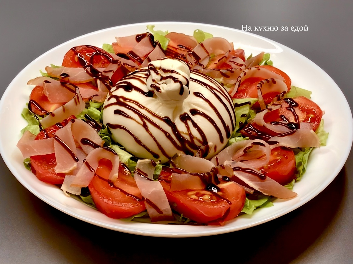 Нежная буррата, солоноватая ветчина и сочные помидоры в этом салате создают идеальное сочетание вкусов. Легкий и сытный, он отлично дополнит обед, ужин или новогодний стол.