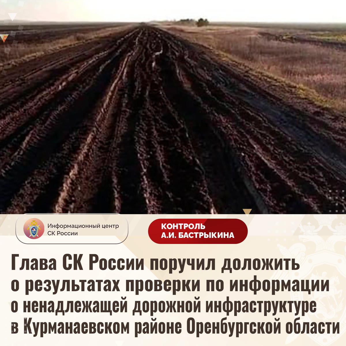 Глава СК России поручил доложить о результатах проверки по информации о ненадлежащей дорожной инфраструктуре в Курманаевском районе Оренбургской области В СМИ сообщается, что в Курманаевском районе Оренбургской области на протяжении длительного времени дорога, ведущая в села Канадауровка и Егорьевка, находится в непригодном состоянии: отсутствует асфальтовое покрытие, на поверхности образовались многочисленные ямы и колеи, в период выпадения осадков грунтовое полотно регулярно размывается. В связи с этим проезд транспортных средств затруднен. Обращения граждан в компетентные органы результатов не принесли. В СУ СК России по Оренбургской области организована процессуальная проверка. Председатель Следственного комитета Российской Федерации Александр Иванович Бастрыкин поручил руководителю СУ СК России по Оренбургской области Вячеславу Давидовичу Зудерману доложить о предварительных и окончательных результатах процессуальной проверки. Исполнение поручения, а также ход процессуальной пров