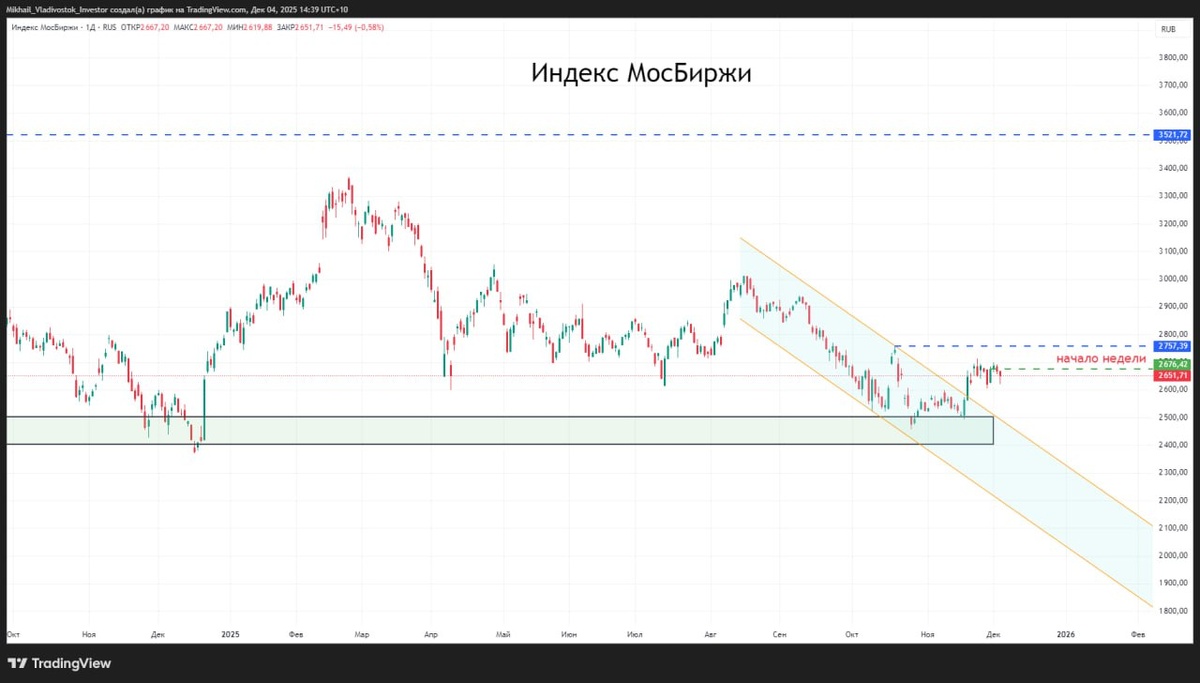 ОБЗОР РОССИЙСКОГО РЫНКА ЗА 03.12.2025 Подробный видео обзор тут👇 📺 https://youtu.be/8vBl8ZhrWkk 😃 https://vkvideo.ru/video-226907663_456239283 Индекс МосБиржи -0,58% Индекс РТС +0,23% Доллар 77,96 руб. (Курс от Банка России) Евро 90,59 руб. (Курс от Банка России) Юань 10,87 руб. По графику: #imoex $MXZ5 Индекс МосБиржи продолжает двигаться в боковике вдоль отметок начала недели. После вчерашних переговоров попробовали сходить ниже, но не хватило силёнок у продавцов. Сегодня представители США встречаются с секретарём Совета национальной безопасности и обороны Украины в Майами. Ждем оттуда весточку и возможную волатильность на рынке. Опять же смотря во сколько встреча.. Возможно уже рынок будет отдыхать. Фьючерс на Индекс МосБиржи Двигаемся в боковике. Нравится мне то, что снова не ушли ниже поддержки 264975. Ну и желательно снова быстро откупать продажи и вылетать вверх, обновляя ближайший максимум 272500. РТС Хороший глобальный отскок продолжается. Сейчас тестируем максимум 1