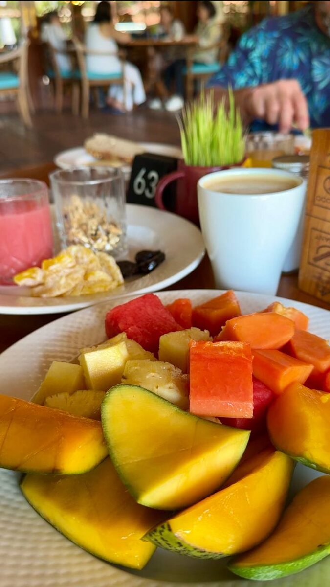 Тепла с Бали вам привезти не обещаю, но много энергии и идей для видео - ДААА🤩🌷 Потому что здесь получила много впечатлений, отдыха и витаминов. Перезагрузка прошла успешно🌟 В течение дня, и особенно утром, ели много фруктов: папайя (очень люблю с соком лайма), ананас, арбуз, манго. А тот яркий фрукт, из которого сделан смузи в прошлом посте, называется «питахайя красная» ( dragon fruit). Для меня - он больше красивый, чем вкусный)). На завтрак можно было набрать разных фруктов и вам сделают из них ваш любимый смузи🍹 Про спорт вспомнила после первой недели отдыха 😅, но поняла, что уже соскучилась по нагрузкам и чувству «подтянутого тела» 💪
