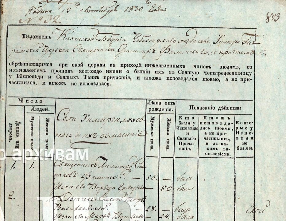 1830 год. Село Тимирчи. Чебоксарский уезд. Васильевский Пётр Алексеевич.
