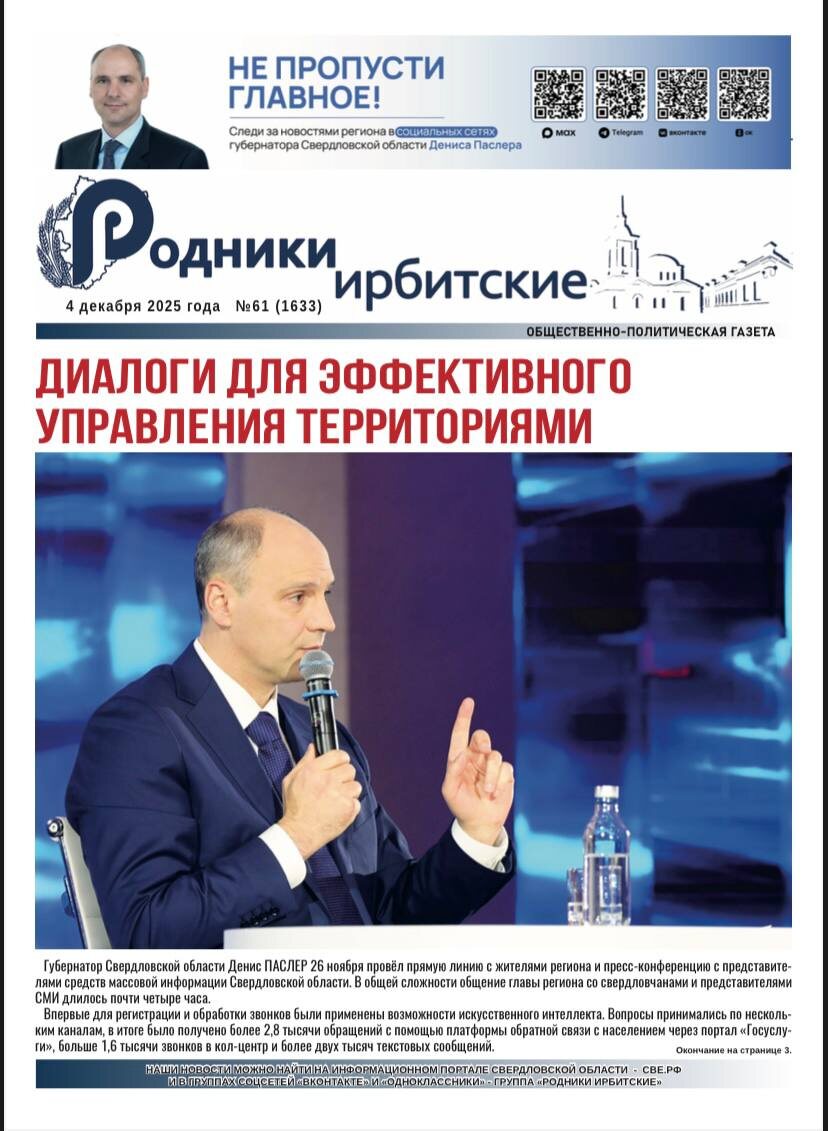 В новом номере газеты «Родники Ирбитские» читайте: СТО ЛЕТ В МОЛОЧНОМ ПРОИЗВОДСТВЕ На праздновании 100-летия Ирбитского молочного завода глава региона Денис ПАСЛЕР и директор Группы «Синара» Виктор ЛЕШ подписали соглашение о строительстве молочно - товарной фермы в нашем районе. НОВЫЙ ВЕКТОР РАЗВИТИЯ СПК «Пригородное» ввел в эксплуатацию первый корпус нового молочного комплекса в Березовке. «СКРИПКА» ПОДДЕРЖКИ И НАДЕЖДЫ Сегодня плетение маскировочных сетей для нужд участников СВО поставлено на поток: более трехсот штук сплетено берегинями района только за последние девять месяцев. 📍Подписаться на канал