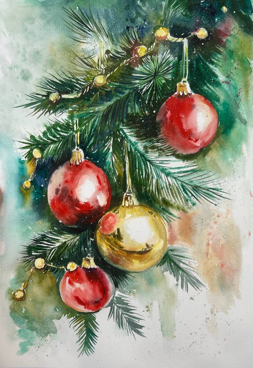 🔴 Акварель — научимся рисовать сверкающие новогодние шарики на ёлке.