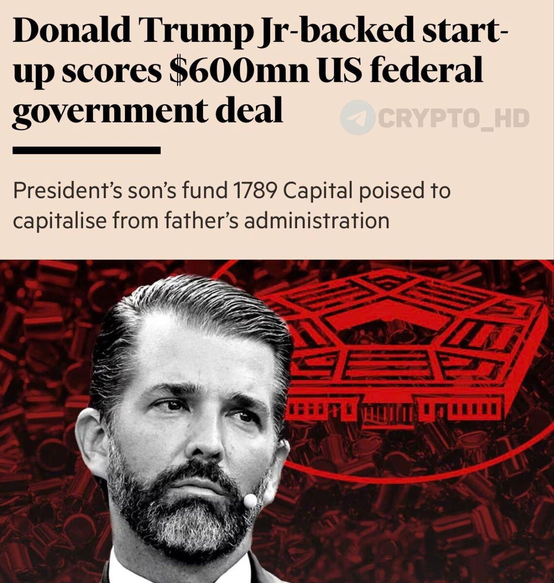 ☹️ Сын Дональда Трампа заработает на Пентагоне. Министерство войны США выделило $620m малоизвестной компании Vulcan Elements, занимающейся редкоземельными металлами и производством магнитов. ❗️Главная деталь: Стартап получил инвестиции от фонда 1789 Capital, который возглавляет Дональд Трамп-младший, всего за три месяца до сделки. Ключевые факты сделки: • У Vulcan Elements всего около 30 сотрудников, но она получила крупнейший кредит в истории Управления стратегического капитала Пентагона. • Это уже четвертая компания, поддержанная фондом 1789 Capital, которая получает федеральные деньги в 2025 году. Общая сумма – более $735m. • Vulcan Elements и Минобороны утверждают, что фонд Трампа-младшего не участвовал в переговорах и решение принято по заслугам. • Финансирование – часть масштабной сделки на $1,4b для развития цепочек поставок редкоземельных магнитов внутри США. Ранее: - крипто-империя Трампа рушится - расследование в отношении WLFI Crypto Headlines