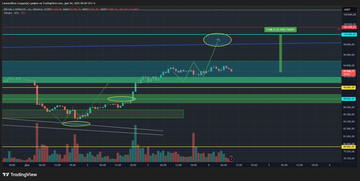 В ответ на пост #мнениепорынку 🕯🕯🕯 ⚠️BTC дневной свечой закрылся выше уровня 93К, ключевого уровня сопротивления на пути в зону уровня 100К = подтверждение тренда роста! На 1м локальном графике, который вы видите ежедневно, виден ярко выраженный закреп цены над промежуточным блоком (уже зеленого цвета), который ранее я выделял, как промежуточную зону сопротивления!! ⚠️Соответственно, сейчас и в ближайшие дни всё моё внимание по BTC будет сосредоточенно на данной промежуточной поддержке, где каждая очередная реакция покупателя от неё, будет всё выше двигать цену моих среднесрочных позиций по альтам + это отличные ТВХ для внутри дневных лонгов! Обратный выход цены ниже блока на 4Н ТФ = очередная перезагрузка + как минимум отмена локальных лонгов!! ⚠️Второй график 1D ТФ для понимания явного паттерна ДД на дневном ТФ = мощный разворотный паттерн, где вчерашняя дневная свеча технически подтверждает продолжение роста. Повторюсь, исторически в большинстве аналогий, дальнейший рост возоб