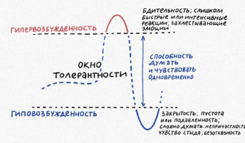 В тему реакций и состояний Гипер-возбуждение — это тот самый режим «меня несёт». Когда тело включает «бей или беги»: вспышка злости, гнев, ярость, желание сорваться, хлопнуть дверью, наорать, убежать. Это может случиться, когда реально нужно защитить себя или близких, но если фона много, мы начинаем лететь на своих - на тех, кто вообще ни при чём. Появляются эмоциональные срывы, резкость, иногда даже элементы насилия — словом или делом. Это то место, где потом стыдно и очень знакомо: «Я опять не сдержалась…» - вот это сейчас со мной происходит Когда злиться бессмысленно или опасно, система переключается в другой полюс-гипо-возбуждение. Это реакция «замри»: тело как будто сдаётся, появляется бессилие, хочется лечь и никого не видеть, дыхание неглубокое, движения вялые. Внутри звучит: «А что стараться», «что воля, что неволя». Если так жить долго, формируется выученная беспомощность - ощущение, что влиять ни на что нельзя, можно только терпеть и выживать. Полезно честно ответить с