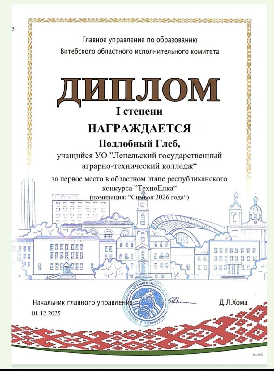 ⚡️Стали известны результаты областного этапа республиканского конкурса «ТехноЕлка», в котором активное участие каждый год принимают учащиеся Лепельского государственного аграрно-технического колледжа 😊Конкурс нацелен на выявление и поддержку талантливых учащихся, пропаганду инновационных идей и развитие объединений по интересам в технической сфере. 😊37 учреждений среднего специального образования представили более 233 творческих работ, выполненных из традиционных и инновационных материалов, таких как дерево, стекло, резина,3 шишки, обычная бумага и др. 🏆Приятно отметить, что в номинации "Символ года-2026" учащийся колледжа Глеб Подлобный занял 1 место. 👏Поздравляем Глеба и его руководителя Александра Хацкевича с победой! 🎄Лепельская техноелка вместе с другими лучшими экспонатами скоро будет направлена в учреждение образования «Национальный детский технопарк» для участия в заключительном этапе республиканского конкурса «ТехноЕлка».