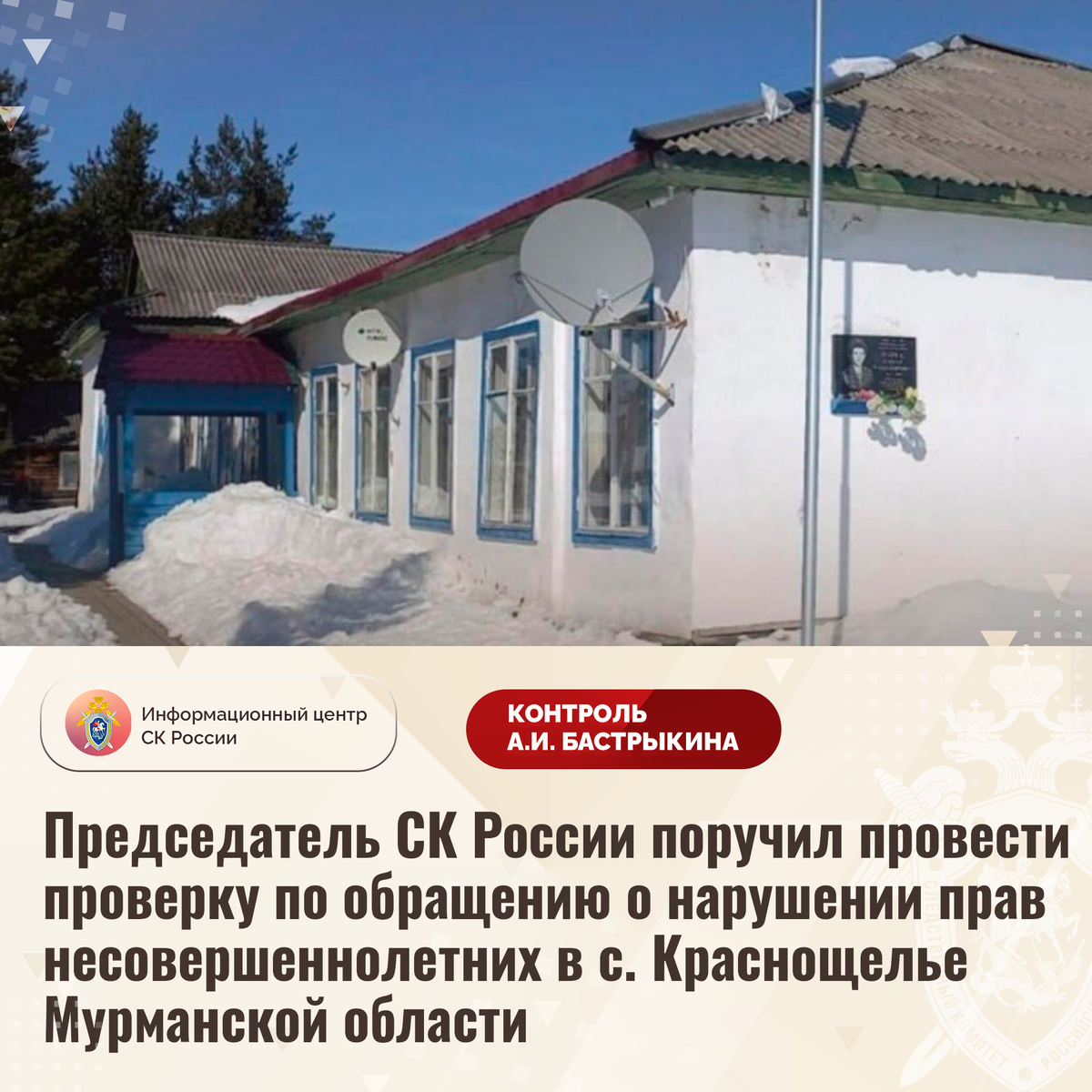 Председатель СК России поручил провести проверку по обращению о нарушении прав несовершеннолетних в с. Краснощелье Мурманской области В Информационный центр СК России поступило обращение по вопросу нарушения прав несовершеннолетних в селе Краснощелье Мурманской области. В августе текущего года здание единственной в населенном пункте школы, введенное в эксплуатацию в 1977 году, признано аварийным, а занятия для учеников организованы в несколько смен в детском саду. При этом помещения дошкольного учреждения не переоборудованы под нужды несовершеннолетних. Кроме того, в строении отсутствуют спортивный зал и библиотека. Многочисленные обращения в различные инстанции результатов не принесли, мер к проведению капитального ремонта школы либо возведению нового учебного заведения не принимается. Указанная ситуация освещалась в СМИ. Председатель Следственного комитета Российской Федерации Александр Иванович Бастрыкин поручил руководителю СУ СК России по Мурманской области Андрею Александровичу