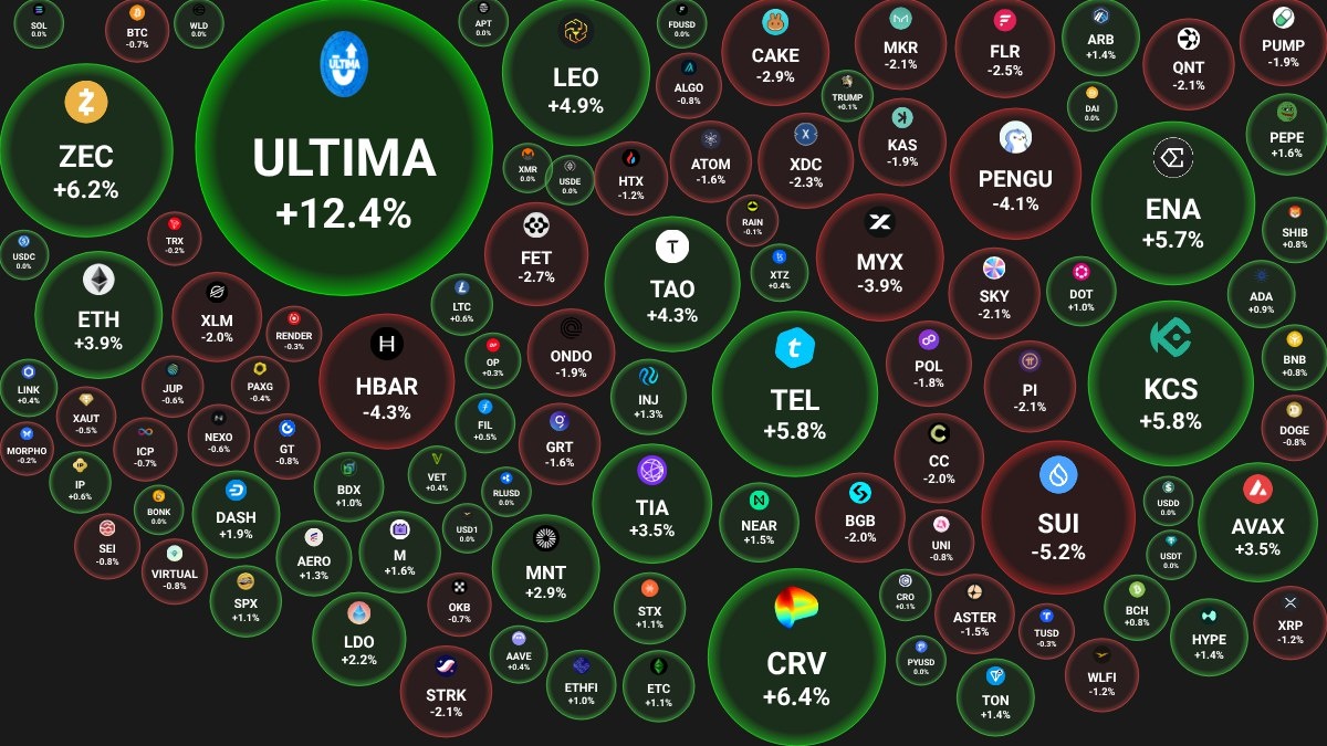 📊 Ежедневный обзор рынка криптовалют от Coinbubbles.ru 🗓 04.12.2025 09:31 по Москве. 🔗 Посмотреть на сайте 📈 Лидеры роста (из ТОП-100): 🟢 Ultima (ULTIMA): $5301 (+12.4%) 🟢 Curve DAO (CRV): $0.4249 (+6.4%) 🟢 Zcash (ZEC): $357 (+6.2%) 📉 Лидеры падения (из ТОП-100): 🔴 Sui (SUI): $1.6645 (-5.2%) 🔴 Hedera (HBAR): $0.1433 (-4.3%) 🔴 Pudgy Penguins (PENGU): $0.0120 (-4.1%) 🔍 Основные метрики: 🟢 Общая капитализация: $3174.66 млрд (+0.06%) 🔴 Общий объем торгов: $151.60 млрд (-9.77%) 🔴 Доминация Bitcoin: 58.60% (-0.48%) 🟢 Доминация Ethereum: 12.18% (+0.45%) 🔴 Индекс страха и жадности: 26 / 100: СТРАХ (-2) ⚪️ Индекс Альтсезона: 21 / 100: БИТКОИН-СЕЗОН (0) 📖 Интересные статьи: 👉 Обзор и сравнение Web3-кошельков от популярных CEX-бирж в 2025 году 👉 Калькулятор стоимости Подарков в Телеграм по флору. 😻 Наши сервисы и бонусы: 💬 Яндекс Дзен - публикуем последние новостии и статьи 📈 Hyperliquid - крупнейшая DEX биржа, занимает 80% объема рынка DEX фьючерсов