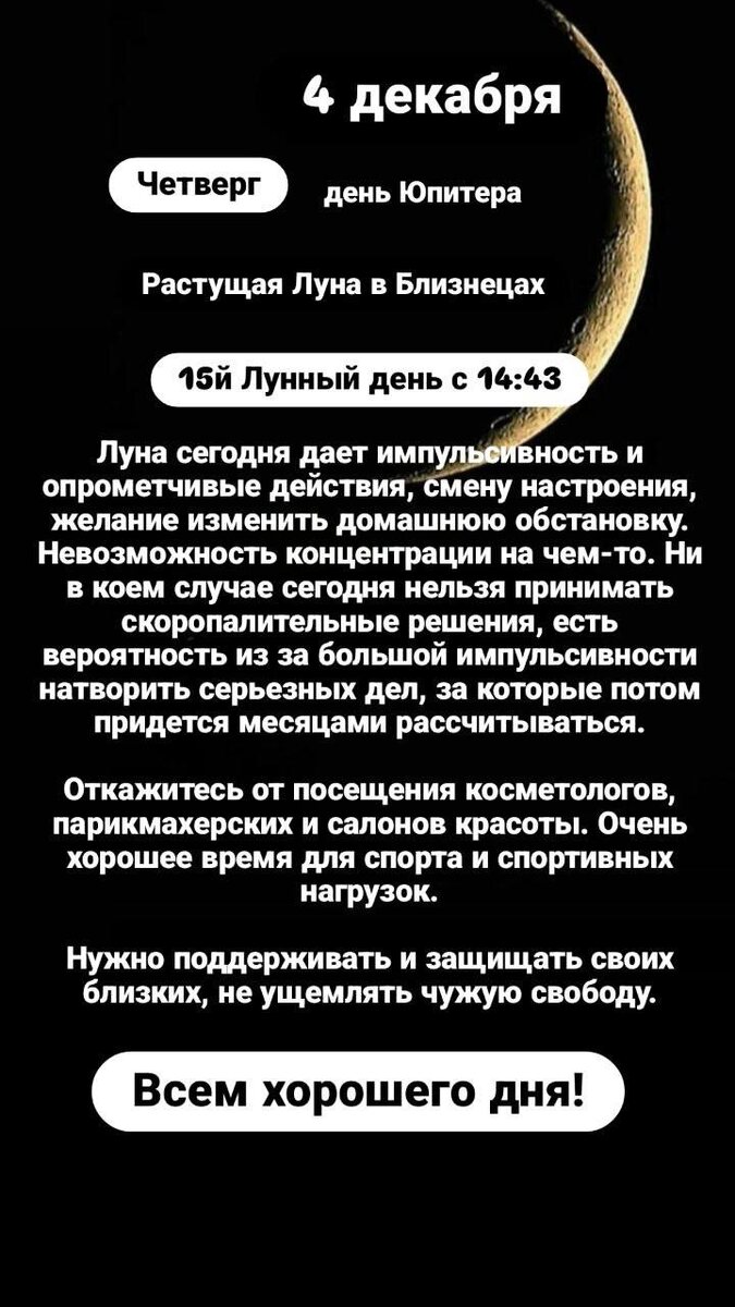 ▶️15 Лунные сутки с 14:43 Символ Шакал или Змея. Сатанинский день, день змея-искусителя, который проявляется в виде утробы человека или его плоти. ✅В некоторых текстах этот день относят к искусителю Ариману - духу плоти, который расслабляет человека, делает его податливым, внушаемым, ленивым, поддающимся любым земным соблазнам. ✅День приворота, сглаза, колдовства, психической уязвимости, кошмарных снов, разгула низших астральных духов, элементалов. ✅День познания тайн, избавления от врагов, поиска кладов, утерянного. ✅В этот день необычайно эффективными буду привороты с подавлением воли, жесткие привороты на подчинение, зомбирование. ✅Очень показана работа с вольтом на страсть и похоть. ✅Все работы Полнолуния нужно проводить именно в этот день. 👍Нельзя в этот день делать серьезные покупки они могут обернуться убытками. ▶️Луна в Близнецах Хорош для знакомств. Обмениваться информацией, идеями. Полезно делать специальную гимнастику для плечевого пояса. Активны: Плечи, руки, пальцы рук,