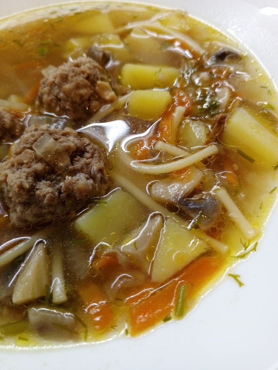 Суп с фрикадельками, лапшой и грибами. Фрикадельки делать самим, положить на полчаса в морозилку. Так они не развалятся при варке. Лук, морковь обжарить. Выложить в бульон, добавить картофель, грибы, фрикадельки. Соль, перец, укроп. Можно подавать со сметаной. На 500 г фарша - 1 луковица, 1 морковь, 200 г шампиньонов и 2 ст. л. сушеных измельчёных белых, 3 картофелины, горсть лапши, горсть укропа. Это просто песня! Готовьте с удовольствием! #готовимдомавкусно #суп #обед #грибы #шампиньоны #лук #морковь #картофель #фрикадельки #сушёные_белые