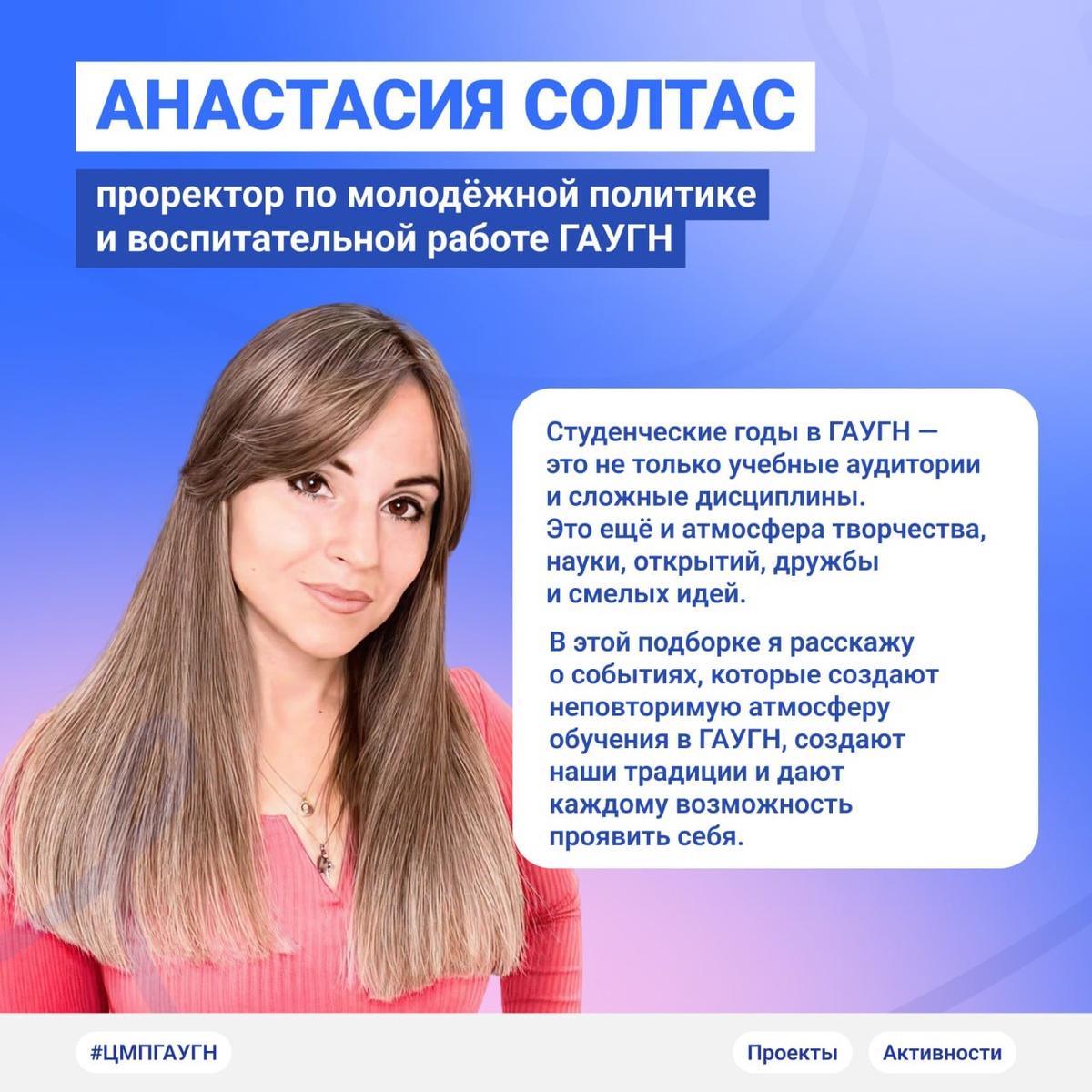🎓 Студенческая жизнь — это больше, чем пары. Это время, когда воплощаются самые смелые идеи! В этой серии постов проректор по молодёжной политике и воспитательной работе ГАУГН Анастасия Солтас расскажет о самых ярких проектах, которые создают ритм университетской жизни. ✨ Это первая часть подборки. Вы узнаете о проектах, где поддерживают творчество, формируют дружеские связи, создают традиции и ту самую атмосферу ГАУГН. Листайте карточки, выбирайте проекты и смело включайтесь в активную жизнь университета! 👀 У нас достаточно пространства для реализации каждого студента. #ГАУГН #ПроектыГАУГН #ЦМП_ГАУГН #МолодёжьГАУГН #СтудентыГАУГН #ВозможностиГАУГН