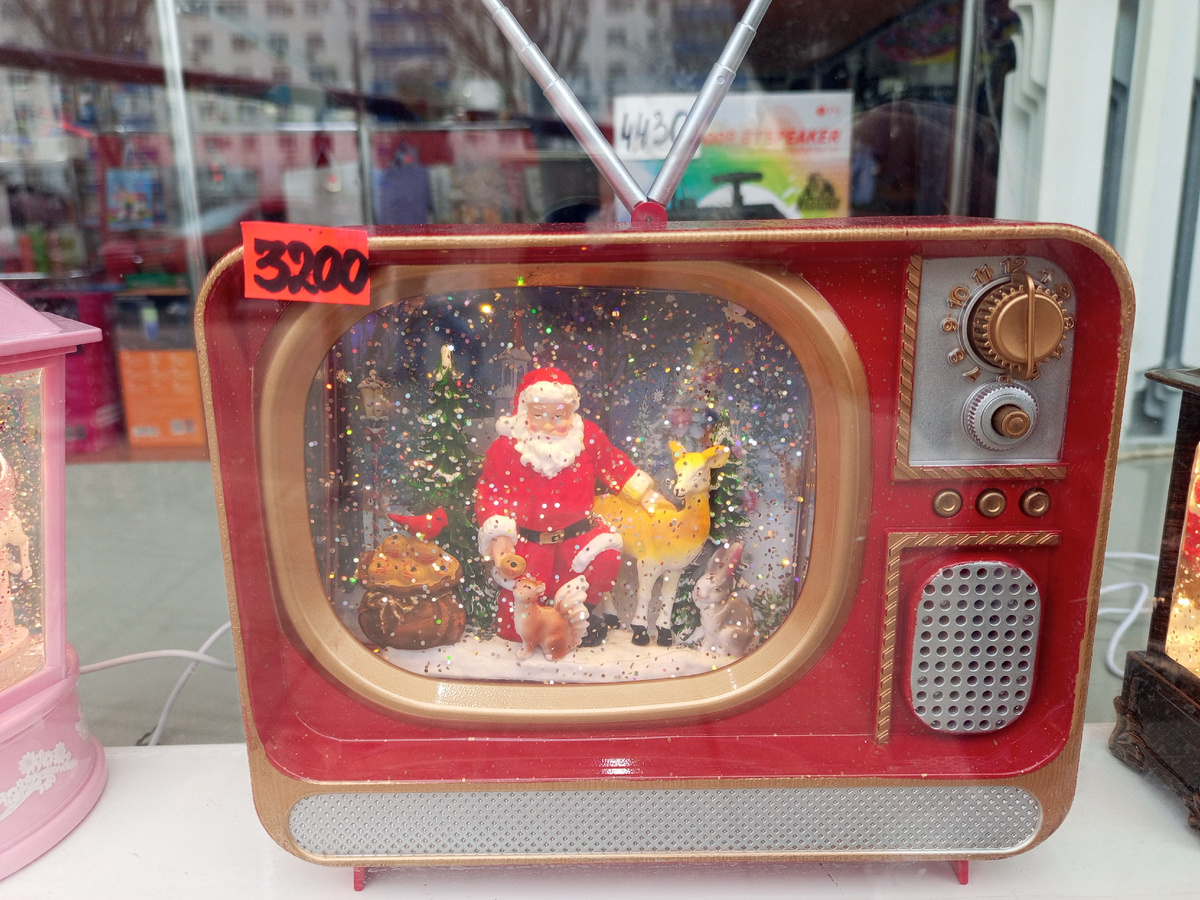Здравствуйте, друзья! Вот и не заметили, как уже вторая неделя декабря началась. У нас похолодало , но все еще в плюсе. И как будто депрессивный ноябрь еще не отпускает . И что - то не пишется и не снимается, и никаких идей в голове. А в городе народ занят праздничными планами, покупками подарков, составлением меню и закупкой продуктов. Суета кругом. Вот такие вещицы увидела в витрине магазина низких цен. Но цены, как видите, далеко не низкие.😨 С подсветкой и летающим снегом. Размер у них совсем не большой с записную книжку. С ценой конечно перемудрили, но вещицы симпатичные. Хотели бы такой телевизор в подарок ? Молодежь моя конечно Новый год встречает , как многие россияне. Ну может немного потише и поскромнее. А мы с мужем, пока не закончится пост, все веселье и разнообразие блюд отодвигаем к Рождеству. А там уж и жарим и парим и запекаем. Так что сейчас особо не суетимся. Но елка , стол и шампанское с селедкой под шубой, конечно будут. Без этого никак. А в деревне я все е