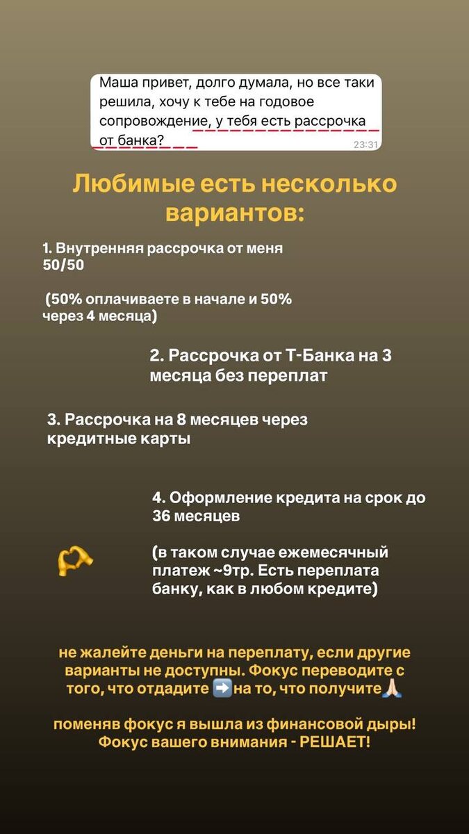 других вариантов, любимые, у меня нет ❤️🔥 Тема оплаты и поиск решения на вас🤗 , как на взрослых женщинах. Всё, что я могла - предложила. ✨ При желании возможно всё! Заявляю с уверенностью! Потому что для меня оплата никогда не была препятствием, если я ощущала ценность для себя) 😘 К себе с Любовью, милые. И фокус вперед!