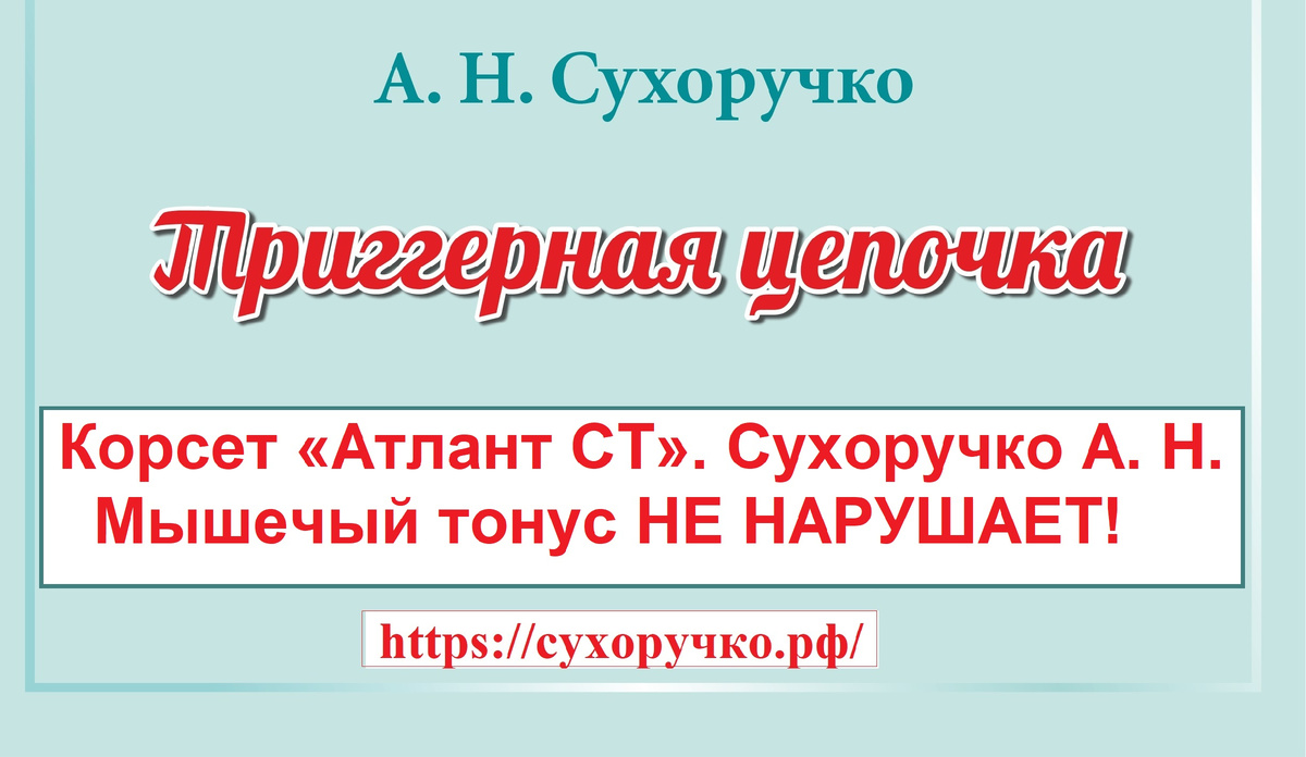 Триггерные цепочки /склеротомалгии формируются при статико-динамической перегрузке (СДП) и проявляется болями в спине, разных суставах. Для уменьшения СДП в поясничном отделе был изобретён в 1995 г. корсет «Атлант СТ». Его эффективность доказана практикой. Мышечный тонус корсет «Атлант СТ» не уменьшает. Сухоручко А.Н. «Тендомиотерапия» — это русская инновационная концепция оздоровления организма, без: неврологии, лекарств, МРТ, УЗИ, нейрохирургии, остеопатии, мануальной терапии, костоправства, психотерапии, тренажёров. Концепция состоит из методик «Статик Про», «Триггерная цепочка», «Тонус Ап!», «Атлант СТ», «Гармония слова» (высылается ознакомительный файл). С помощью концепции устанавливается диагноз, определяется тактика оздоровления и профилактики; устраняются боли, головокружение, онемение; восстанавливается и укрепляется работа позвоночника, суставов; вертикализируется осанка; улучшается функция психической, сердечно-сосудистой, дыхательной, половой систем. Почувствуй легкость,