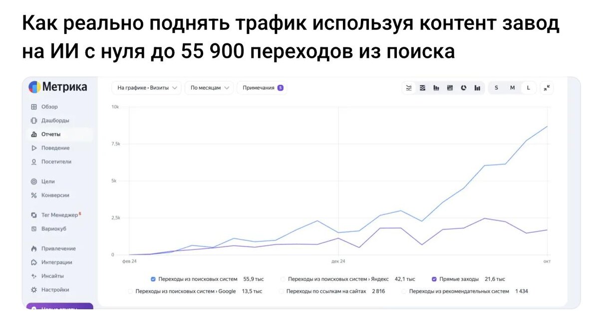 Интернет снова завален статьями "как поднять трафик с помощью ИИ". 99% из них пишут люди, у которых трафика нет. ⚡️ Мы пошли наоборот: сначала сделали, потом расписали. Кейс по Meropriyatel.ru выкатили на VC - vc.ru/ai/2617334-kak-podnyat-trafik-s-pomoshchyu-ii Что происходит под капотом ИИ пашут, люди не hero-ствуют ночами: * Семантику собирает ИИ, а не стадо стажеров с Excel * Несколько ИИ одновременно пилят структуру, текст, мету и обложки * Make работает как конвейер: раз в несколько часов рождается свежая статья в WordPress, уже с рубриками, тегами и картинкой Чем занят человек Аккаунт-менеджер не пишет "душевные тексты". Он просто приходит, смотрит: эти статьи вылезли в топ и начали собирать клики - их дорабатываем, остальное - лесом. Там же он проставляет перелинковку и докручивает кластеры, которые уже приносят трафик. ⚡️ По факту Блог превратился в контент-завод на ИИ, который не просит отпуск и не ноет про выгорание. Цифры, графики и внутренности сценария тут: vc.ru/ai/