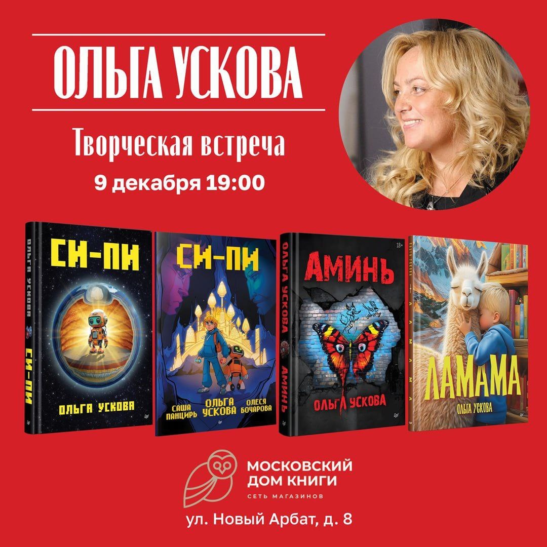 ПИТЕР - ВСЁ, МОСКВА - НА СТАРТЕ! Народ, в Петербурге регистрация закрыта. Там уже легкий перебор по численности. Еду к вам! Соскучилась. Потом сразу - Вжух! И встреча в Москве на Арбате! Для Москвы я готовлю очень серьезную тему. Будем говорить про Супероружие, про нейро-лингвистическую войну, про документы на которых возникла "Аминь". Количество мест ограничено. Открываем регистрацию. 9 декабря в 19:00 в Московском доме книги на Новом Арбате состоится творческая встреча с автором бестселлеров «Аминь» и «Си-Пи» - Ольгой Усковой. Ольга Ускова – известный российский предприниматель в сфере создания искусственного интеллекта для беспилотного транспорта в России, странах Латинской Америки, Африки, Азии, Ближнего Востока и СНГ, основатель и президент группы компаний Cognitive Technologies, генеральный директор Cognitive Pilot, автор романов-бестселлеров «Этюды Черни» и «Раша», а также книг для детей «СИ-ПИ» и «Ламама». На творческой встрече Ольга Ускова расскажет, как возникают и реал