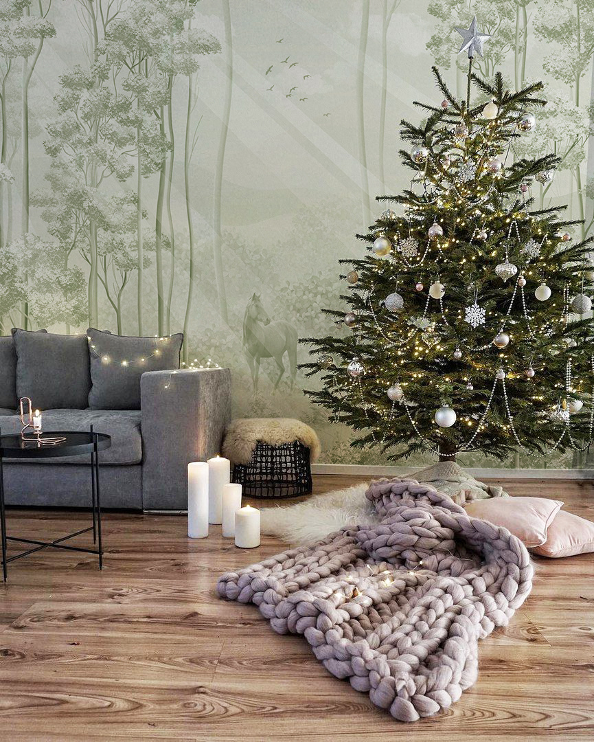 Новогоднее настроение берут не миллионы деталей, а одна сильная идея: лесная панорама, камин с гирляндой, крупный абстрактный узор в праздничных тонах. Выберите одну точку-акцент и работайте вокруг неё.