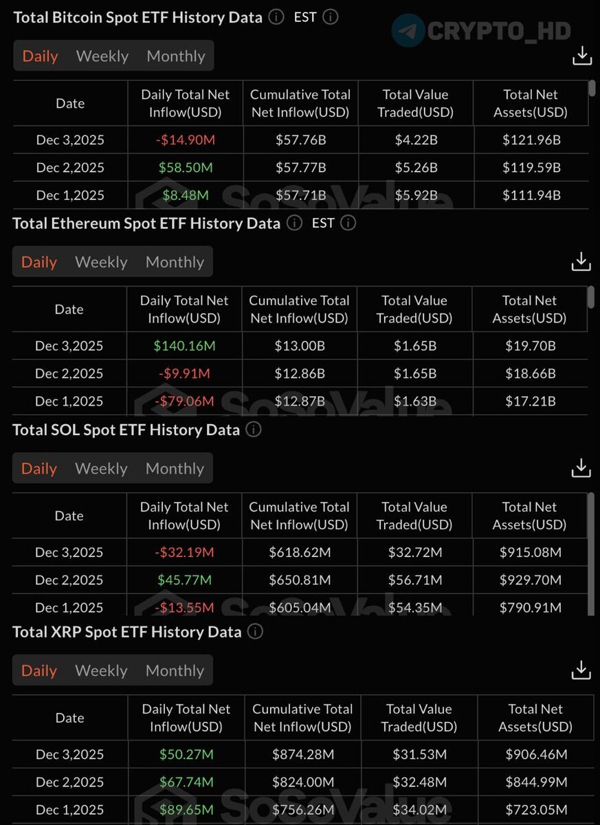 ETF Π·Π° Π²ΡΠ΅ΡΠ°ΡΠ½ΠΈΠΉ Π΄Π΅Π½Ρ: βͺ#BTC = -$14,900,000. βͺ#ETH = +$140,160,000. βͺ#SOL = -$32,190,000. βͺ#XRP = +$50,240,000 (13 Π·Π΅Π»Π΅Π½ΡΡ