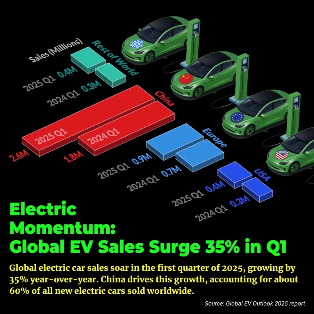 π ΠΠ»Π΅ΠΊΡΡΠΎΠΌΠΎΠ±ΠΈΠ»ΡΠ½ΡΠΉ Π±ΡΠΌ Π½Π°ΡΠ°Π»ΡΡ! Π ΠΏΠ΅ΡΠ²ΠΎΠΌ ΠΊΠ²Π°ΡΡΠ°Π»Π΅ 2025 Π³ΠΎΠ΄Π° ΠΌΠΈΡΠΎΠ²ΡΠ΅ ΠΏΡΠΎΠ΄Π°ΠΆΠΈ ΡΠ»Π΅ΠΊΡΡΠΎΠΌΠΎΠ±ΠΈΠ»Π΅ΠΉ ΠΏΡΠ΅Π²ΡΡΠΈΠ»ΠΈ 4 ΠΌΠ»Π½ Π΅Π΄ΠΈΠ½ΠΈΡ β ΡΡΠΎ Π½Π° 35% Π±ΠΎΠ»ΡΡΠ΅, ΡΠ΅ΠΌ Π·Π° ΡΠΎΡ ΠΆΠ΅ ΠΏΠ΅ΡΠΈΠΎΠ΄ Π² 2024 Π³ΠΎΠ΄Ρ. Π ΠΎΡΡ ΡΡΠΊΠΎΡΡΠ΅ΡΡΡ ΠΏΠΎ ΡΡΠ°Π²Π½Π΅Π½ΠΈΡ Ρ ΠΏΡΠ΅Π΄ΡΠ΄ΡΡΠΈΠΌΠΈ Π³ΠΎΠ΄Π°ΠΌΠΈ! π ΠΡΠΎ Π»ΠΈΠ΄ΠΈΡΡΠ΅Ρ? β ΠΠΈΡΠ°ΠΉ: Π±ΠΎΠ»Π΅Π΅ 2,5 ΠΌΠ»Π½ ΡΠ»Π΅ΠΊΡΡΠΎΠΌΠΎΠ±ΠΈΠ»Π΅ΠΉ (β60% ΠΌΠΈΡΠΎΠ²ΠΎΠ³ΠΎ ΡΡΠ½ΠΊΠ°). Π ΡΠ΅Π²ΡΠ°Π»Π΅ ΠΈ ΠΌΠ°ΡΡΠ΅ Π΄ΠΎΠ»Ρ EV Π² ΠΏΡΠΎΠ΄Π°ΠΆΠ°Ρ