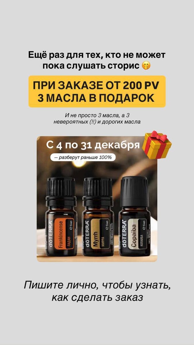 Такая щедрость от doTERRA в декабре!! ✨ Редкие, СИЛЬНЫЕ и дорогие эфирные масла, которые называют маслами «разговора с Богом» — это ладан, копайба и мирра. Вы получите их в подарок при заказе от 200 PV с 4 по 31 декабря 🎁 НО!!! Разберут их намного раньше 31 декабря, это я ГА-РАН-ТИ-РУ-Ю. Такой щедрости ещё не было, в прошлом году в подарок был только ладан. Если хотите успеть, пишите в комментарии или в личные сообщения. Подскажу, как оформить заказ и получить три мощнейших масла в подарок 👇🏻 👇🏻 В этом посте есть большое видео, которое не загрузилось в Дзен. Откройте оригинал поста в телеграме, чтобы его посмотреть