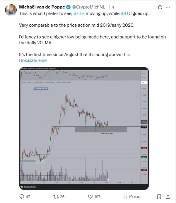 Вот что я предпочитаю видеть: эфириум растёт, а биткоин также движется вверх. Ситуация очень похожа на движение цены в середине 2019 года / начале 2020 года. Мне бы хотелось увидеть формирование более высокого локального минимума здесь, а поддержку — на 20-дневной скользящей средней (20-MA). Это первый раз с августа, когда актив торгуется выше этой скользящей средней, и это может сигнализировать о силе.