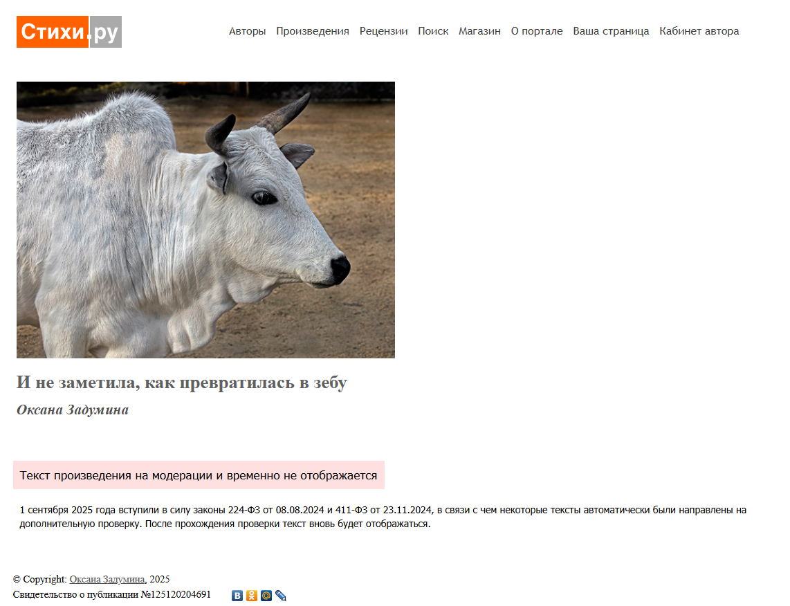 Иногда модераторы осторожно относятся к произведениям, где животные используются как метафора для человека. Ваш текст включает строки про «жизнь людей меняет», «домашней стала», «жир» и т. д. — возможно, система посчитала это сатирой, социальным подтекстом или критикой кого-то конкретного.