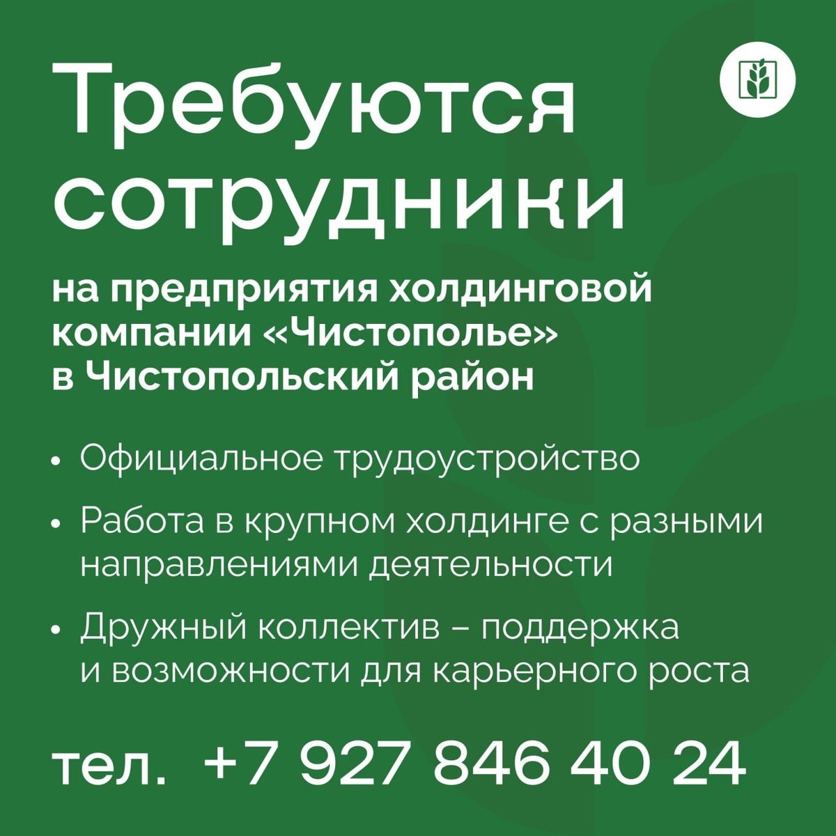 В ХК "Чистополье" требуются сотрудники👍🏻 🔘Главный инженер (от 170-200 тыс. руб.) 🔘Подсобный рабочий (Ж/М) (50-80 тыс. руб.) 🔘Уборщик производственных помещений (45 тыс. руб.) 🔘Водитель погрузчика, машинист фронтального погрузчика (70-120 тыс. руб.) 🔘Оператор линиии/Оператор машинного доения (104 тыс. руб.) 🔘Весовщик/Кладовщик (до 70 тыс. руб.) 🔘Слесарь-ремонтник (до 70 тыс. руб.) 🔘Инженер-механик (100 тыс. руб.) 🔘Инженер КИПиА (100 тыс. руб.) 🔘Агроном (100 тыс. руб.) 🔘Агроскаут (100 тыс. руб.) 🔘Руководитель конно-спортивного клуба (до 70 тыс. руб.) 🔘Транспортерщик (от 70 тыс. руб.) 🔘Лаборант/ оператор баз данных (до 60 тыс. руб.) 🔘Инспектор по охране труда (от 45 тыс. руб.) 🔘Тракторист-машинист (до 70 тыс. руб.) 🔘Ветеринарный врач (до 70 тыс. руб.) 🔘Ветеринарный фельдшер (50 тыс. руб.) 🔘Осеменатор (до 90 тыс. руб.) 🔘Сепараторщик (80-150 тыс. руб.) 🔘Оператор сушильных установок (80-120 тыс. руб.) Что мы предлагаем: ✔️Стабильность и уверенность: официальное