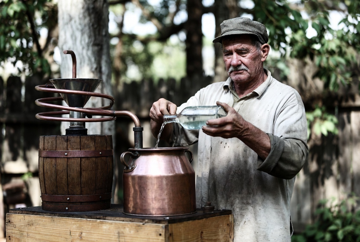 Дядя Митя, потомственный самогонщик, жил в тихой деревушке, где время текло медленно, как брага в его стареньком аппарате. Он гнал самогон по старинке, как дед учил, как прадед завещал. И гнал, надо сказать, неплохо. Крепкий, забористый, с характерным запахом, который в деревне называли "духом свободы". Правда, после этого "духа свободы" наутро в голове звенели колокола, а во рту пересыхало так, будто Сахара переехал в твой рот.
