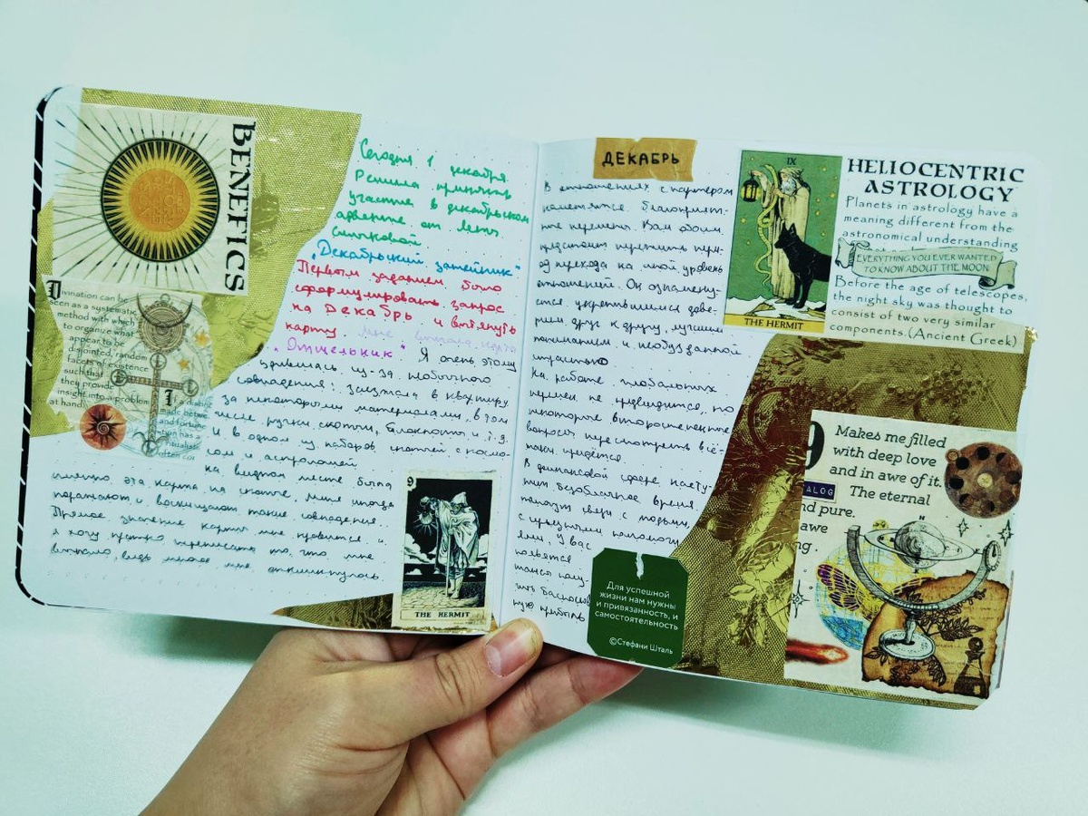 Решила в этом году влиться в уютный хаос — приняла участие в «Декабрьском затейнике» от @smykova_plans! 🎄✨ Первое задание — вытащить случайную карту Таро и записать её значение. Вы знаете, это было неожиданно медитативно и глубоко. Мне так понравился процесс, что я оформила сразу два разворота в блокноте! Теперь с нетерпением жду следующего задания. Кто ещё участвует? Давайте делиться вдохновением! 💫 #декабрьскийзатейник