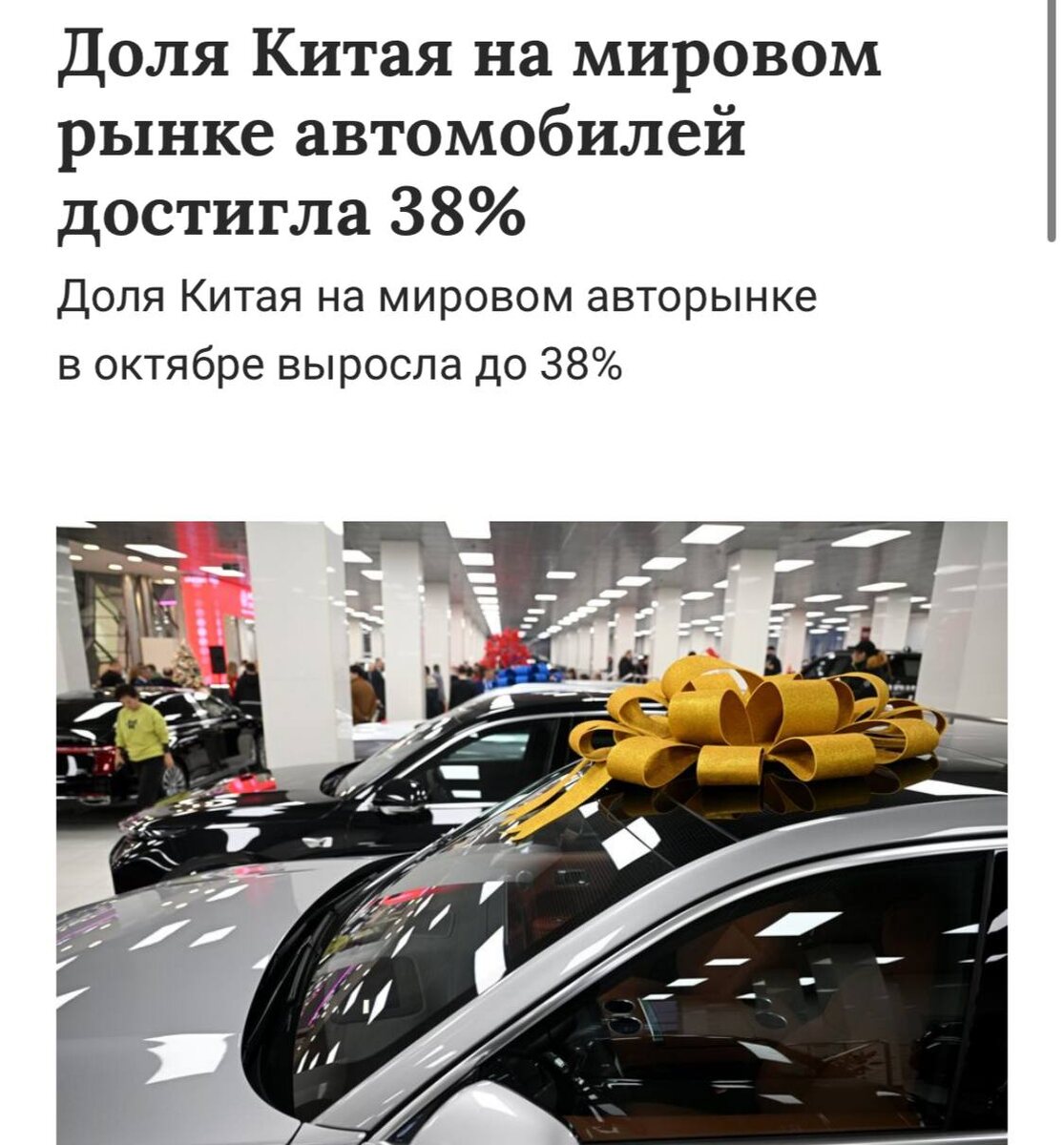 Китай укрепил лидерство на мировом авторынке Доля китайских авто в мире в октябре достигла 38%, прибавив ещё 1% к прошлому году. За месяц продано 3,3 млн машин. С января по октябрь Китай реализовал 27,65 млн авто — это 34,9% глобального рынка и +12% к 2024 году🍔 #работа, #вакансия, #заработок, #деньги, #подработка, #работасейчаc, #водитель, #водителю, #работаводителем, #такси, #таксист, #работавтакси, #курьер, #работакурьером, #доставка, #доставкаеды, #ЯндексЕда, #DeliveryClub, #ЯндексТакси, #Ситимобил, #ЯндексРабота, #Таксиру, #Uber, #UberEats, #GetTaxi, #авто, #автомобиль, #работанаавто, #работанаавтомобиле,, #арендаавто, #такспарк, #ищуработу, #вакансии