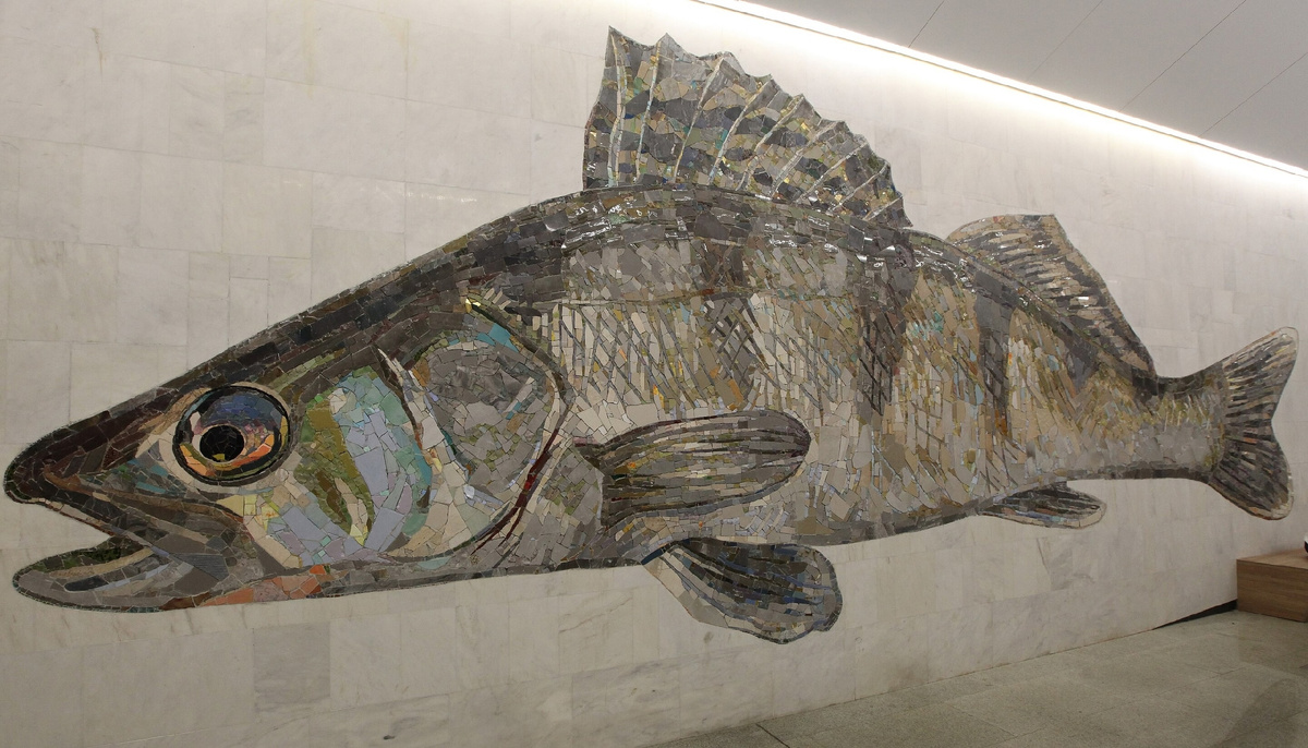 Интересное оформление станции метро "Нагатинский Затон" Московского метрополитена на Большой кольцевой линии. Открыта в 2023 году. "Оформление станции включает мозаичные изображения 12 видов речной фауны (самая крупная - 14 м), обитающих в реках Московского региона. Основные декоративные элементы станции — панно, выполненные в мозаичной технике из натурального камня и смальты. Их автор — мастер-мозаичист Максим Козлов. Вестибюль станции украшают миниатюрные изображения рыб, выполненные с помощью фрезеровки по мрамору, заполненные краской. "