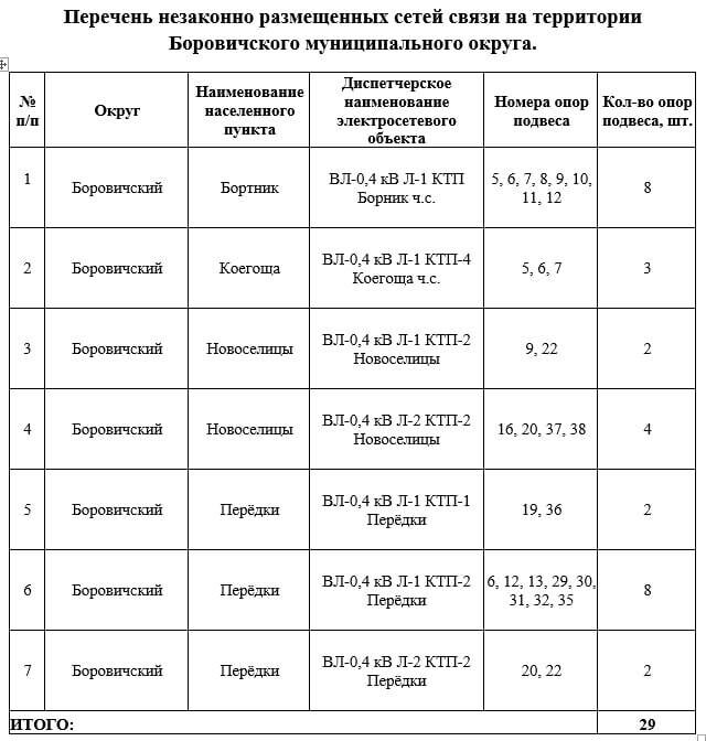 ❗ ВНИМАНИЕ! Новгородский филиал (Россети Северо-Запад) ведет работу по выявлению незаконного (бездоговорного) размещения оборудования и сетей связи сторонних лиц на опорах воздушных линий электропередачи Незаконный подвес кабелей связи обнаружен на опорах ЛЭП Боровичского муниципального округа Новгородской области. При этом владельцев оборудования определить не удалось. ⚡ В случае невозможности определить владельцев, данное имущество подлежит демонтажу как бесхозное. Демонтаж незаконно размещенного оборудования запланирован в период до 31 декабря 2025 года. Перечень подлежащего демонтажу оборудования представлен в таблице.